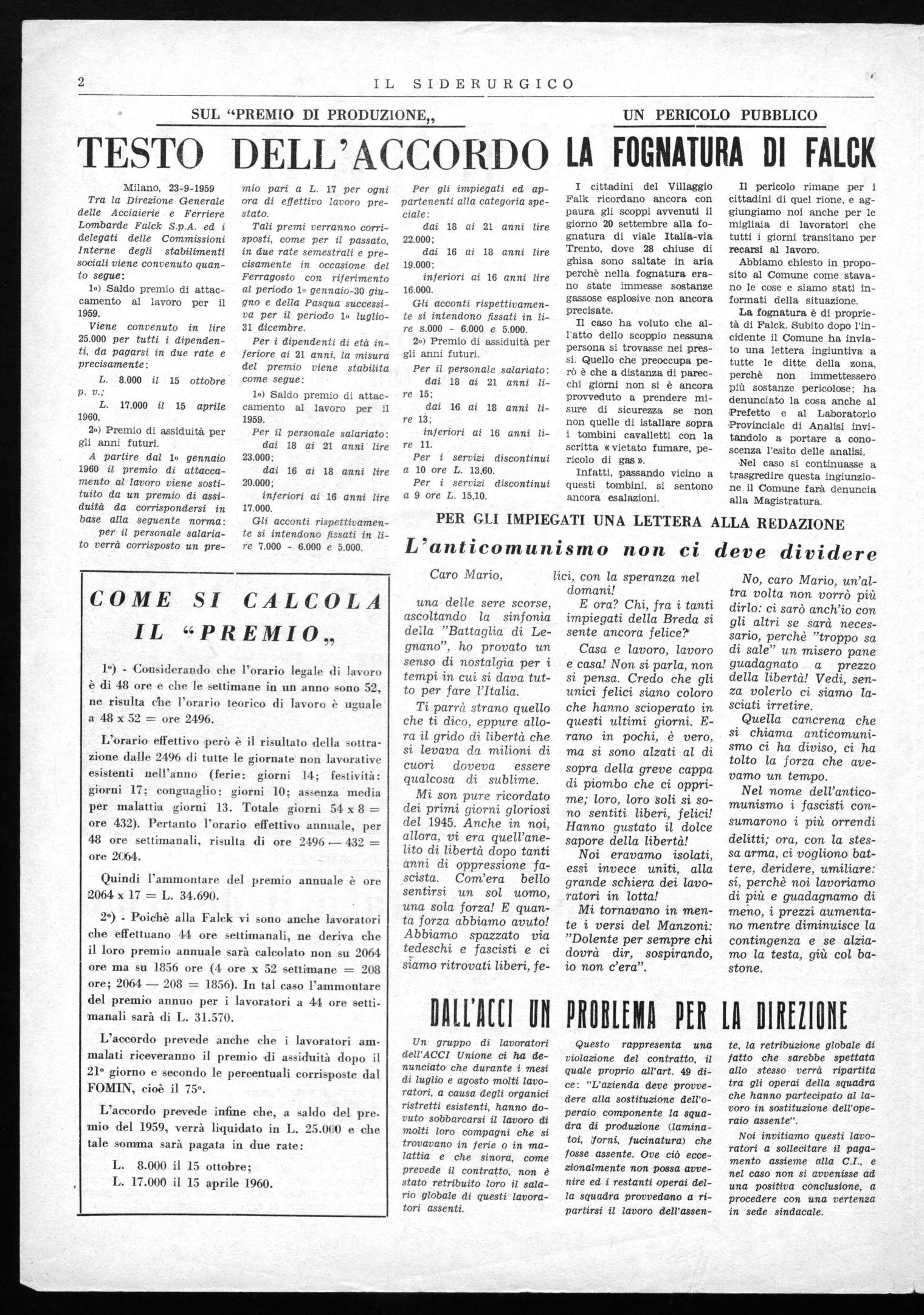Milano, 23-9-1959 Tra la Direzione Generale delle Acciaierie e Ferriere Lombarde Falck S.p.A. ed i delegati delle Commissioni Interne degli stabilimenti sociali viene convenuto quanto segue: