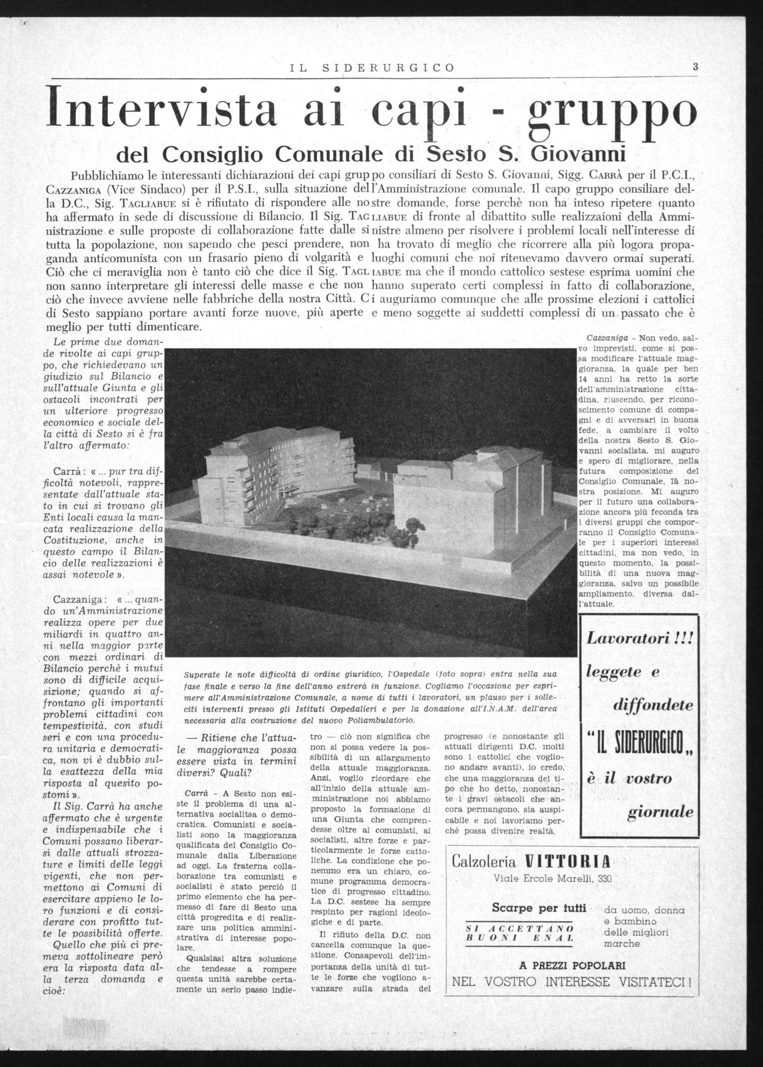 Pubblichiamo le interessanti dichiarazioni dei capi gruppo consiliari di Sesto S. Giovanni, Sigg. CARRI per il P.C.I., CAZZANIGA (Vice Sindaco) per il P.S.I., sulla situazione dell'Amministrazione comunale. Il capo gruppo consiliare della D.C., Sig. TAGLIABUE si è rifiutato di rispondere alle no stre domande, forse perchè non ha inteso ripetere quanto ha affermato in sede di discussione di Bilancio. Il Sig. TAG LIABUE di fronte al dibattito sulle realizzaioni della Amministrazione e sulle proposte di collaborazione fatte dalle si nistre almeno per risolvere i problemi locali nell'interesse di tutta la popolazione, non sapendo che pesci prendere, non ha trovato di meglio che ricorrere alla più logora propaganda anticomunista con un frasario pieno di volgarità e luoghi comuni che noi ritenevamo davvero ormai superati. Ciò che ci meraviglia non è tanto ciò che dice il Sig. TAGL IABUE ma che il mondo cattolico sestese esprima uomini che non sanno interpretare gli interessi delle masse e che non hanno superato certi complessi in fatto di collaborazione, ciò che invece avviene nelle fabbriche della nostra Città. C i auguriamo comunque che alle prossime elezioni i cattolici di Sesto sappiano portare avanti forze nuove, più aperte e meno soggette ai suddetti complessi di un passato che è meglio per tutti dimenticare.
