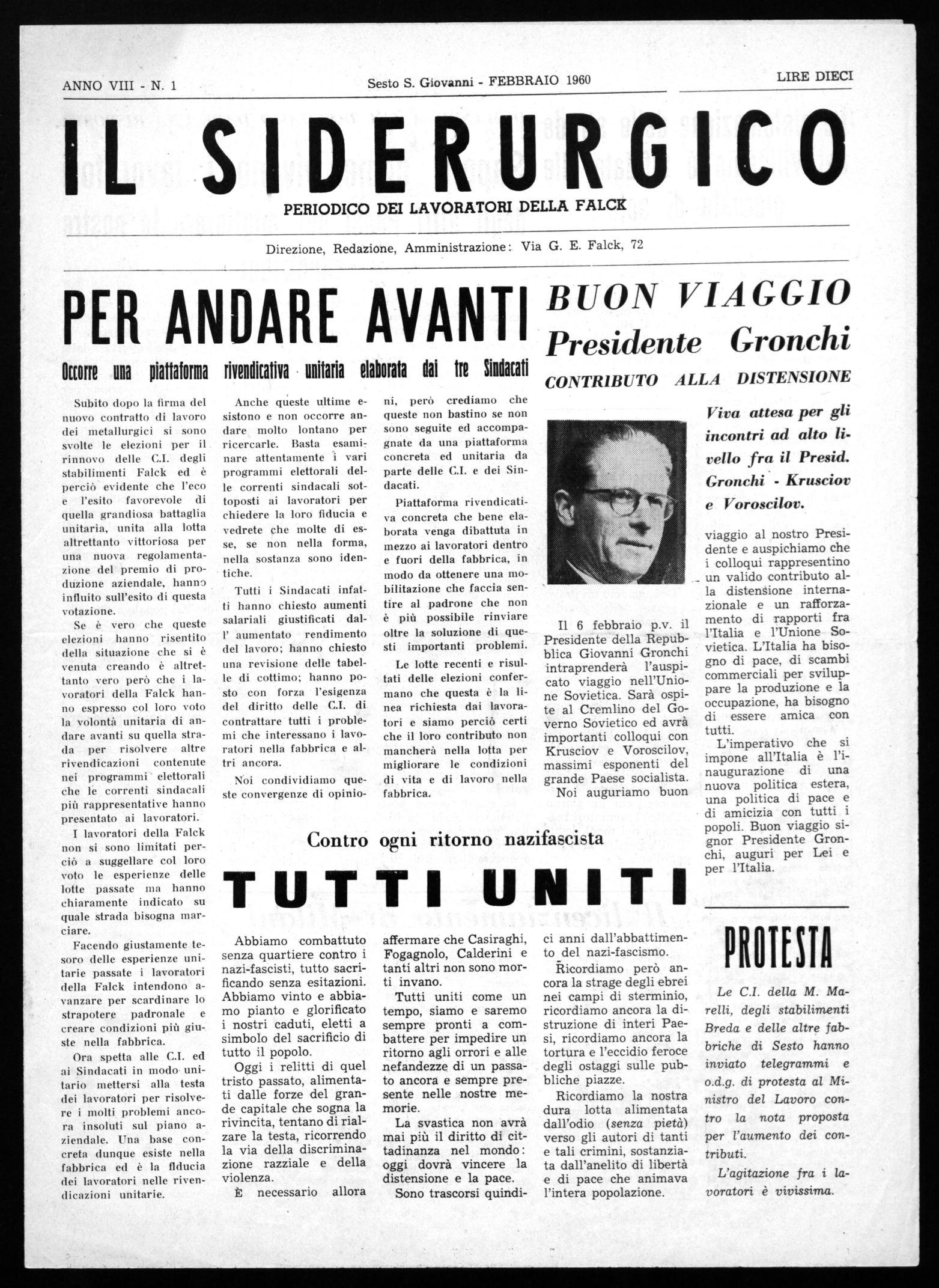 Il 6 febbraio p.v. il Presidente della Repubblica Giovanni Gronchi intraprenderà l'auspicato viaggio nell'Unione Sovietica. Sarà ospite al Cremlino del Governo Sovietico ed avrà importanti colloqui con Krusciov e Voroscilov, massimi esponenti del grande Paese socialista.