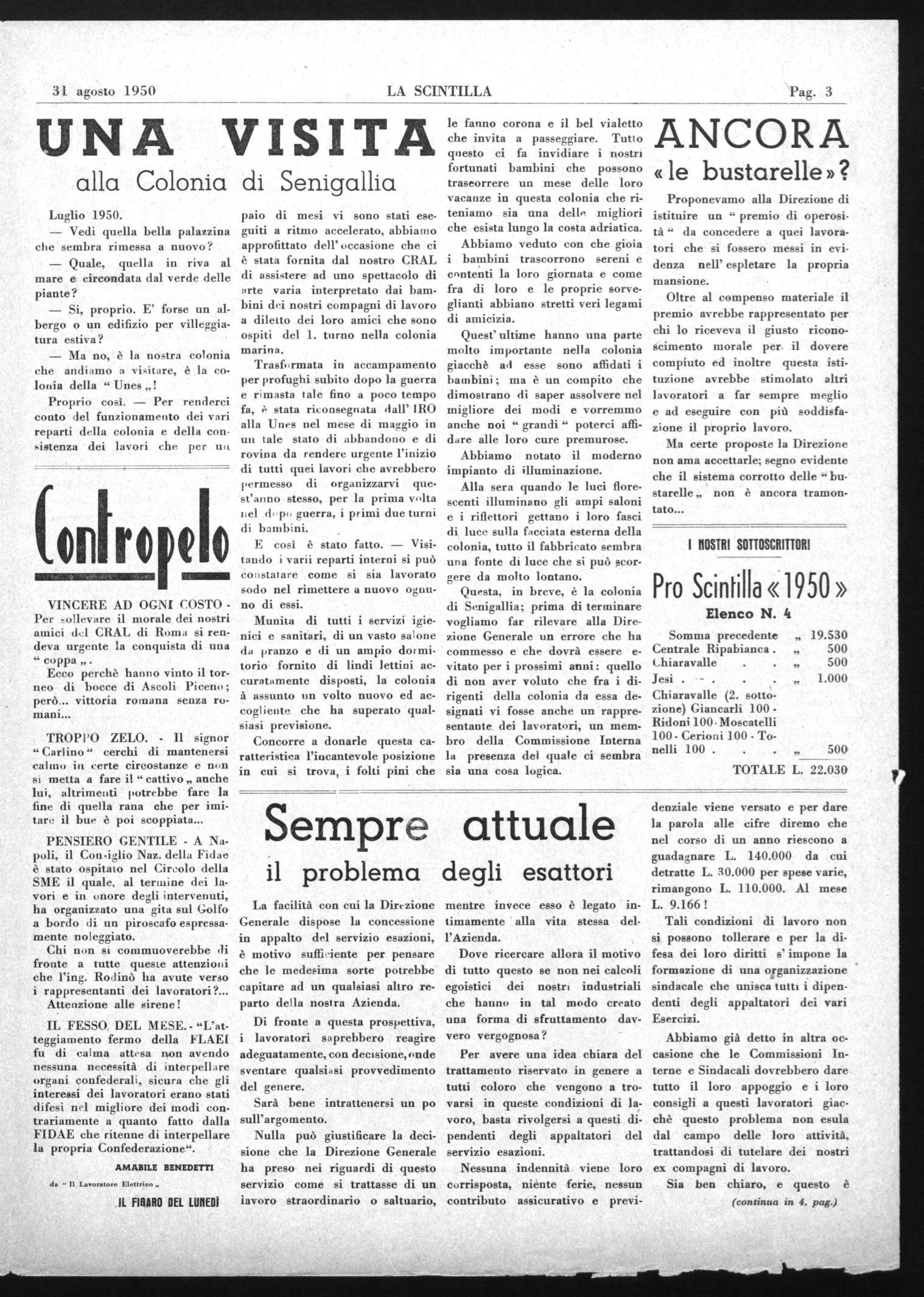 Questa, in breve, è la colonia di Senigallia; prima di terminare vogliamo far rilevare alla Direzione Generale un errore che ha commesso e che dovrà essere evitato per i prossimi anni: quello di non aver voluto che fra i dirigenti della colonia da essa designati vi fosse anche un rappresentante dei lavoratori, un membro della Commissione Interna la presenza del quale ci sembra sia una cosa logica.