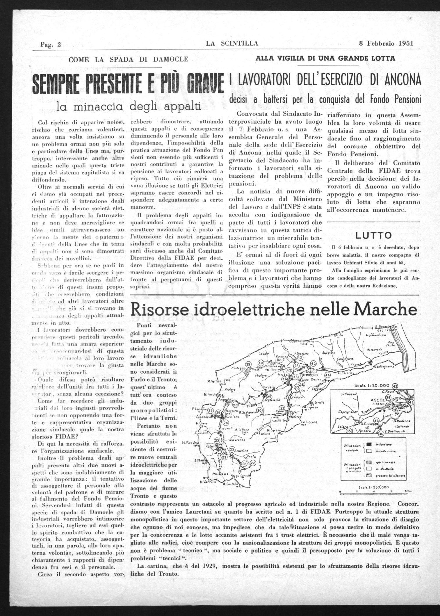 Pertanto non viene sfruttata la possibilità esistente di costruire nuove centrali idroelettriche per la maggiore utilizzazione delle acque del fiume Tronto e questo contrasto rappresenta un ostacolo al progresso agricolo ed industriale nella nostra Regione. Concor. diamo con l'amico Lauretani su quanto ha scritto nel n. I di FIDAE. Purtroppo la attuale struttura monopolistica in questo importante settore dell'elettricità non solo provoca la situazione di disagio che ognuno di noi conosce, ma impedisce che da tale ftlituazione si possa uscire in modo definitivo per la concorrenza e le lotte accanite asistenti fra i trust elettrici. È necessario che il male venga tagliato alle radici, cioè rompere con la nazionalizzazione la struttura dei gruppi monopolistici. E questo non è problema " tecnico ", ma sociale e politico e quindi il presupposto per la soluzione di tutti i problemi " tecnici ".
