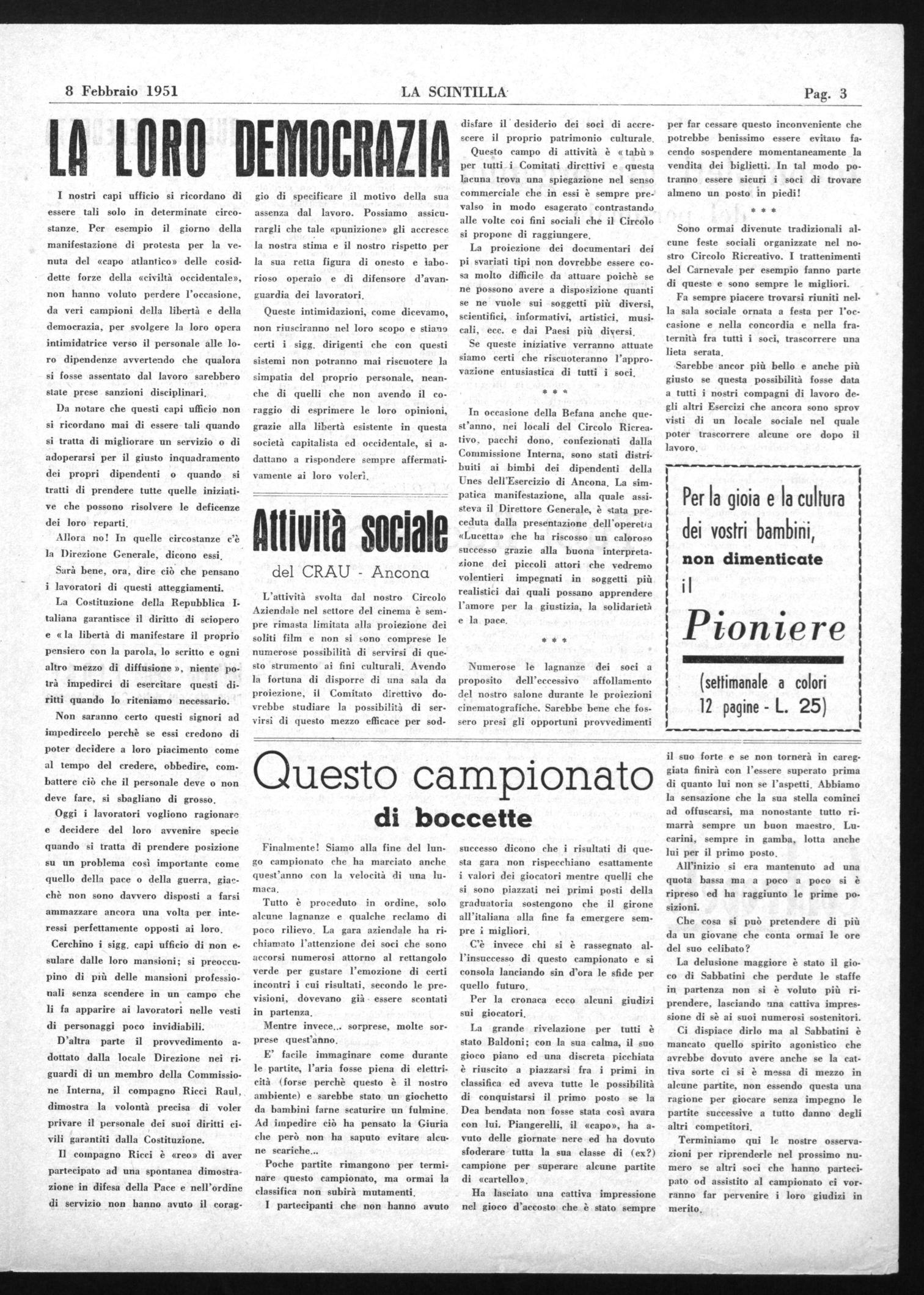 D'altra parte il provvedimento adottato dalla locale Direzione nei riguardi di un membro della Commissione Interna, il compagno Ricci Raul, dimostra la volontà precisa di voler privare il personale dei suoi diritti civili garantiti dalla Costituzione.