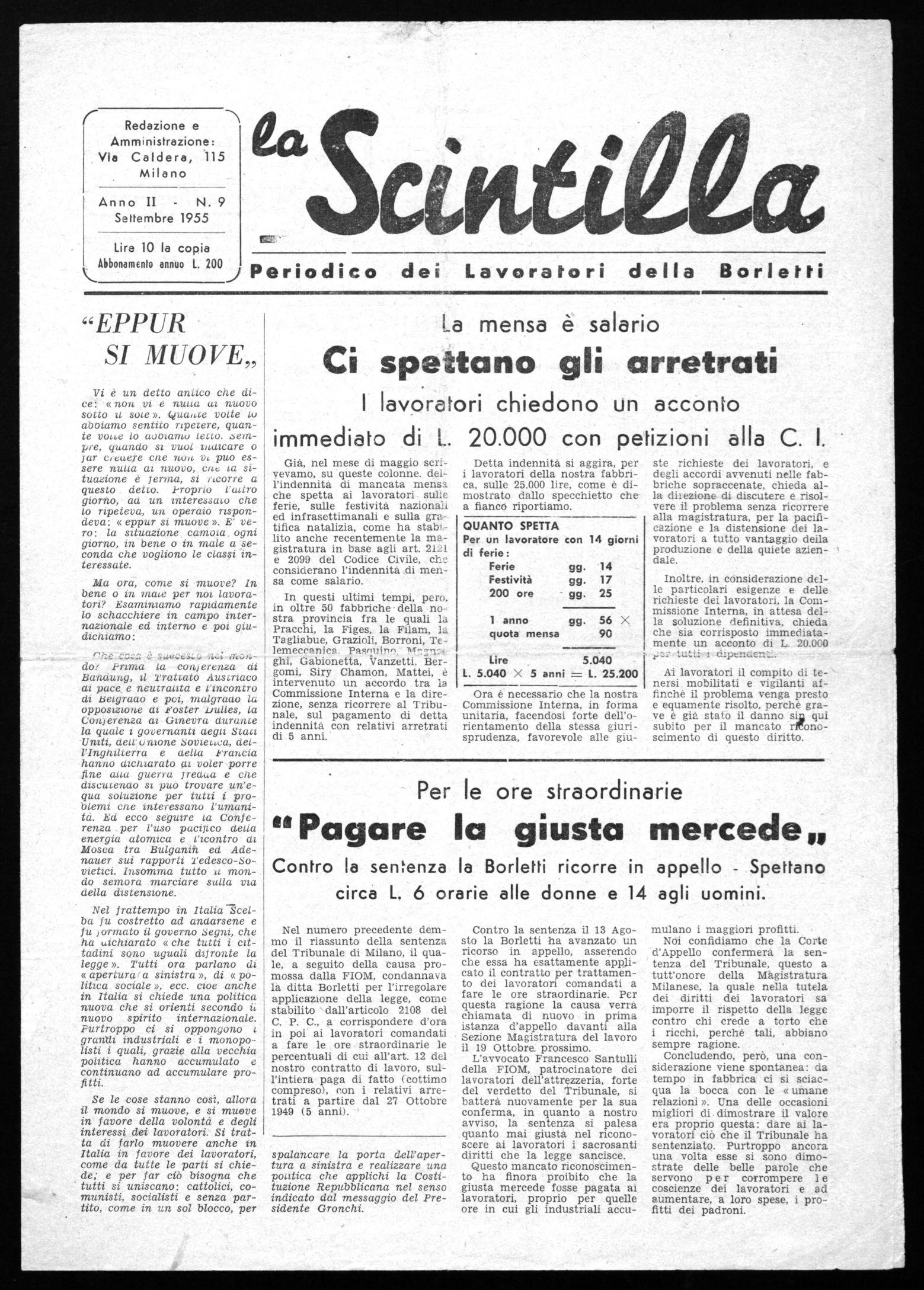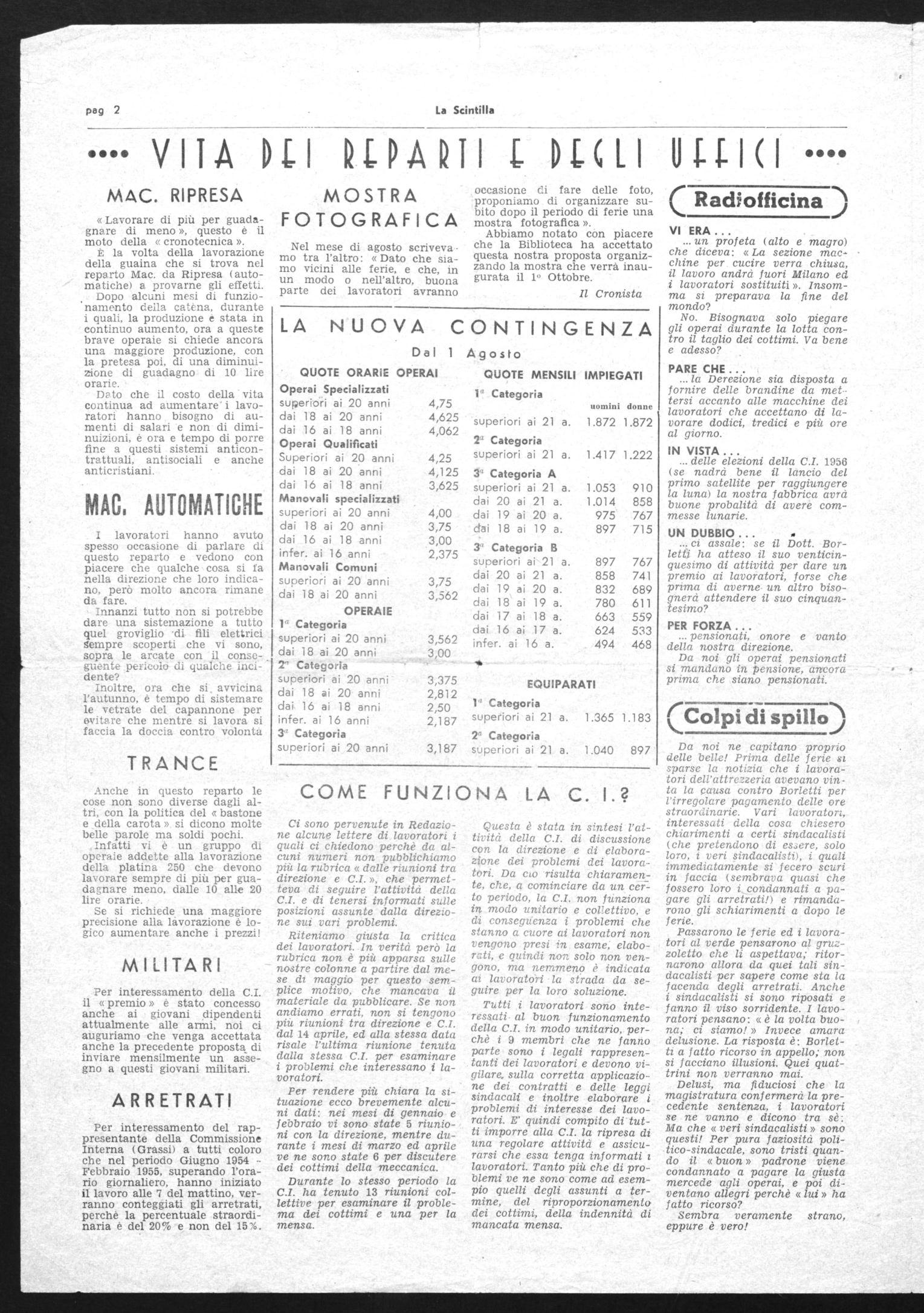 Da noi ne capitano proprio delle belle! Prima delle ferie si sparse la notizia che i lavoratori dell'attrezzeria avevano vinta la causa contro Borletti per l'irregolare pagamento delle ore straordinarie. Vari lavoratori, interessati della cosa chiesero chiarimenti a certi sindacalisti (che pretendono di essere, solo loro, i veri sindacalisti), i quali immediatamente si fecero scuri in faccia (sembrava quasi che fossero loro i condannati a pagare gli arretrati!) e rimandarono gli schiarimenti a dopo le ferie.