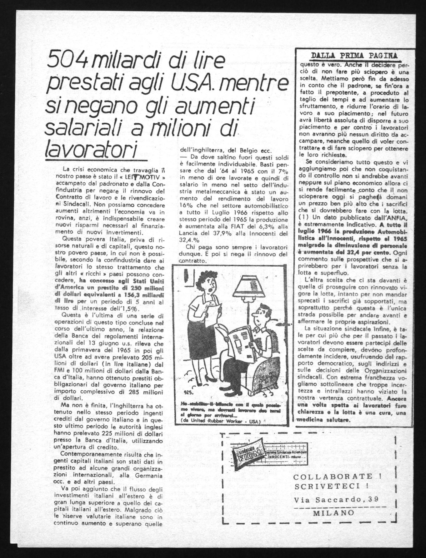 Se consideriamo tutto questo e vi aggiungiamo poi che non coquistando il controllo non si andrebbe avanti neppure sul piano economico allora ci si rende facilmente conto che il non scioperare oggi si paghellà domani un prezzo ben più alto che i sacrifici che si dovrebbero fare con la lotta. ( i ) Un dato pubblicato dall'ANFIA, è estremamente indicativo. A tutto il luglio 1966 la produzione Automobilistica all'Innocenti, rispetto al 1965 malgrado la diminuzioni di personale i 'aumentata del 32,4 per cento. Ogni commento sulle prospettive che si aprirebbero per i lavoratori senza la lotta e superfluo.