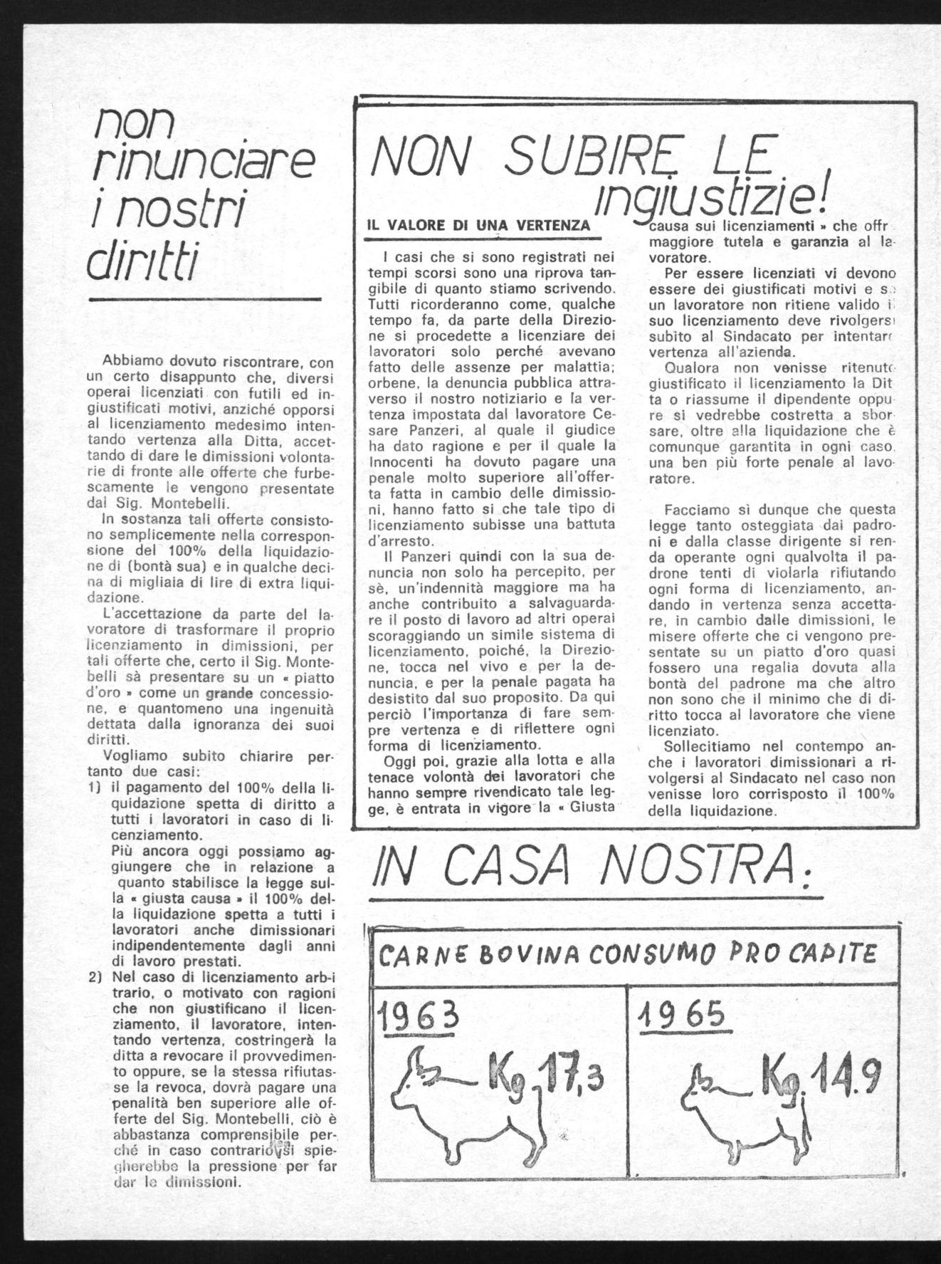 Abbiamo dovuto riscontrare, con un certo disappunto che, diversi operai licenziati con futili ed ingiustificati motivi, anziché opporsi al licenziamento medesimo interitando vertenza alla Ditta, accettando di dare le dimissioni volontarie di fronte alle offerte che furbescamente ie vengono presentate dai Sig. Montebelli.