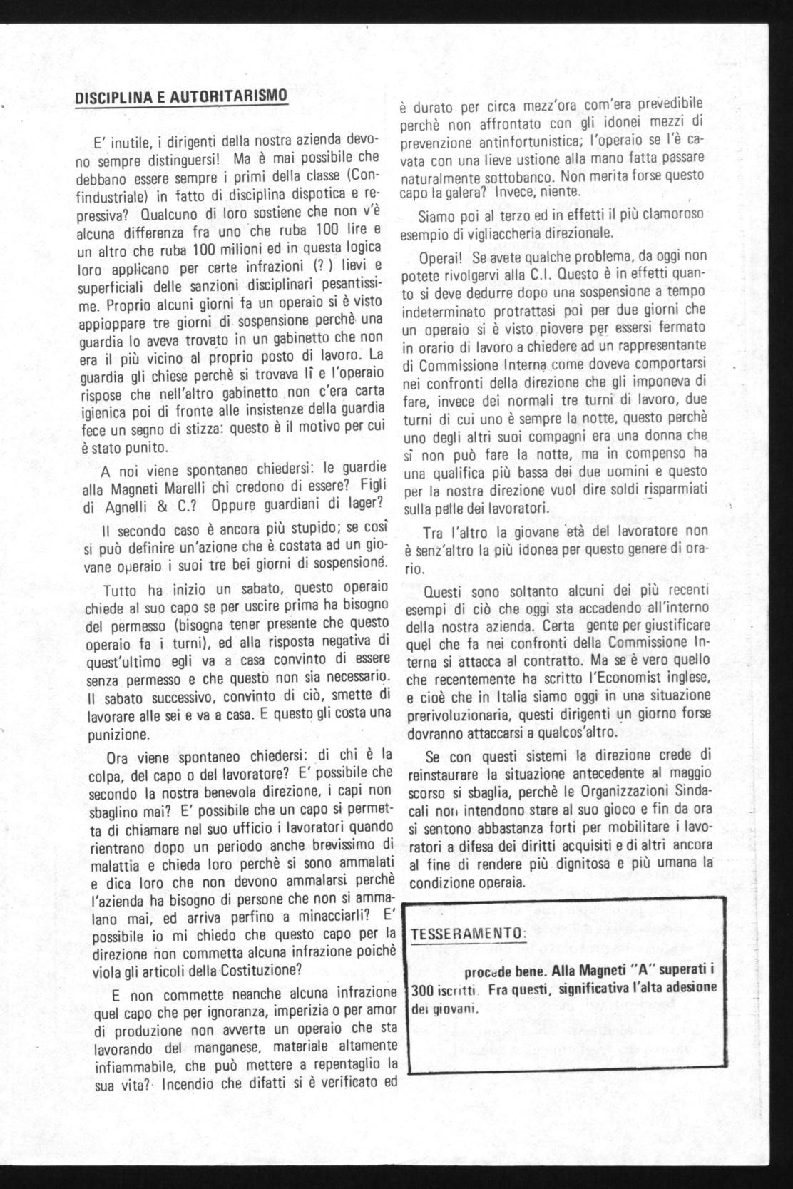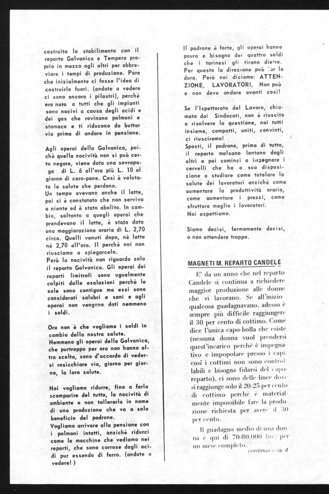 Operai! Se avete qualche problema, da oggi non potete rivolgervi alla C.I. Questo è in effetti quanto si deve dedurre dopo una sospensione a tempo indeterminato protrattasi poi per due giorni che un operaio si è visto piovere per essersi fermato in orario di lavoro a chiedere ad un rappresentante di Commissione Interna come doveva comportarsi nei confronti della direzione che gli imponeva di fare, invece dei normali tre turni di lavoro, due turni di cui uno è sempre la notte, questo perchè uno degli altri suoi compagni era una donna che sî non può fare la notte, ma in compenso ha una qualifica più bassa dei due uomini e questo per la nostra direzione vuol dire soldi risparmiati sulla pelle dei lavoratori.
