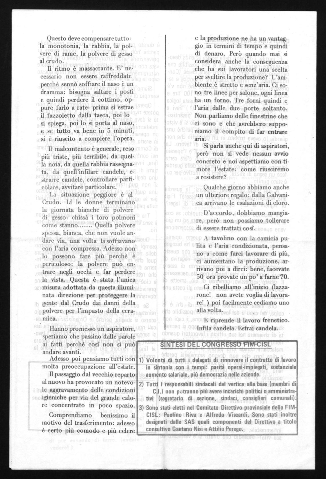 Se con questi sistemi la direzione crede di reinstaurare la situazione antecedente al maggio scorso si sbaglia, perchè le Organizzazioni Sindacali noie intendono stare al suo gioco e fin da ora si sentono abbastanza forti per mobilitare i lavoratori a difesa dei diritti acquisiti e di altri ancora al fine di rendere più dignitosa e più umana la condizione operaia.