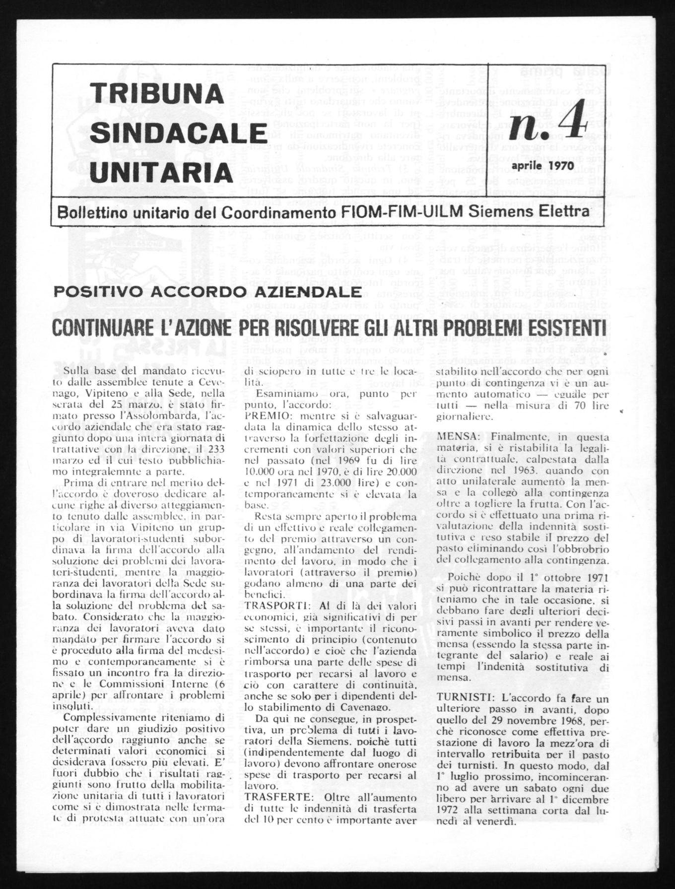 Tribuna Sindacale Unitaria può, in questo quadro, assolvere ad una grande funzione se tutti i lavoratori della Siemens Elettra lo sentono come il loro giornalino aziendale, collaborano ad esso con scritti, notizie, opinioni, e così via.