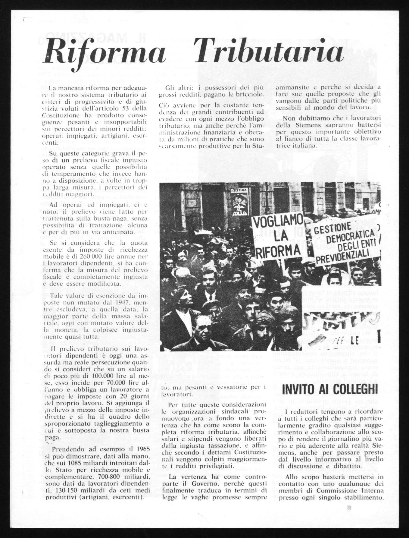 Per tutte queste considerazioni le organizzazioni sindacali promuovorlo .ora a fondo una vertenza che ha come scovo la completa riforma tributaria, aflinchè salari e stipendi vengono liberati dalla ingiusta tassazione, e affinchè secondo i dettami- Costituzionali vengono colpiti maggiormente i redditi privilegiati.