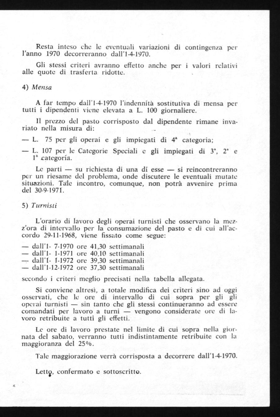 TURNISTI: L'accordo fa fare un ulteriore passo in avanti, dopo quello del 29 novembre 1968, perchè riconosce come effettiva prestazione di lavoro la mezz'ora di intervallo retribuita per il pasto dei turnisti. In questo modo, dal 1" luglio prossimo, incominceranno ad avere un sabato ogni due libero per hrrivare al 1" dicembre 1972 alla settimana corta dal lunedì al venerdì.