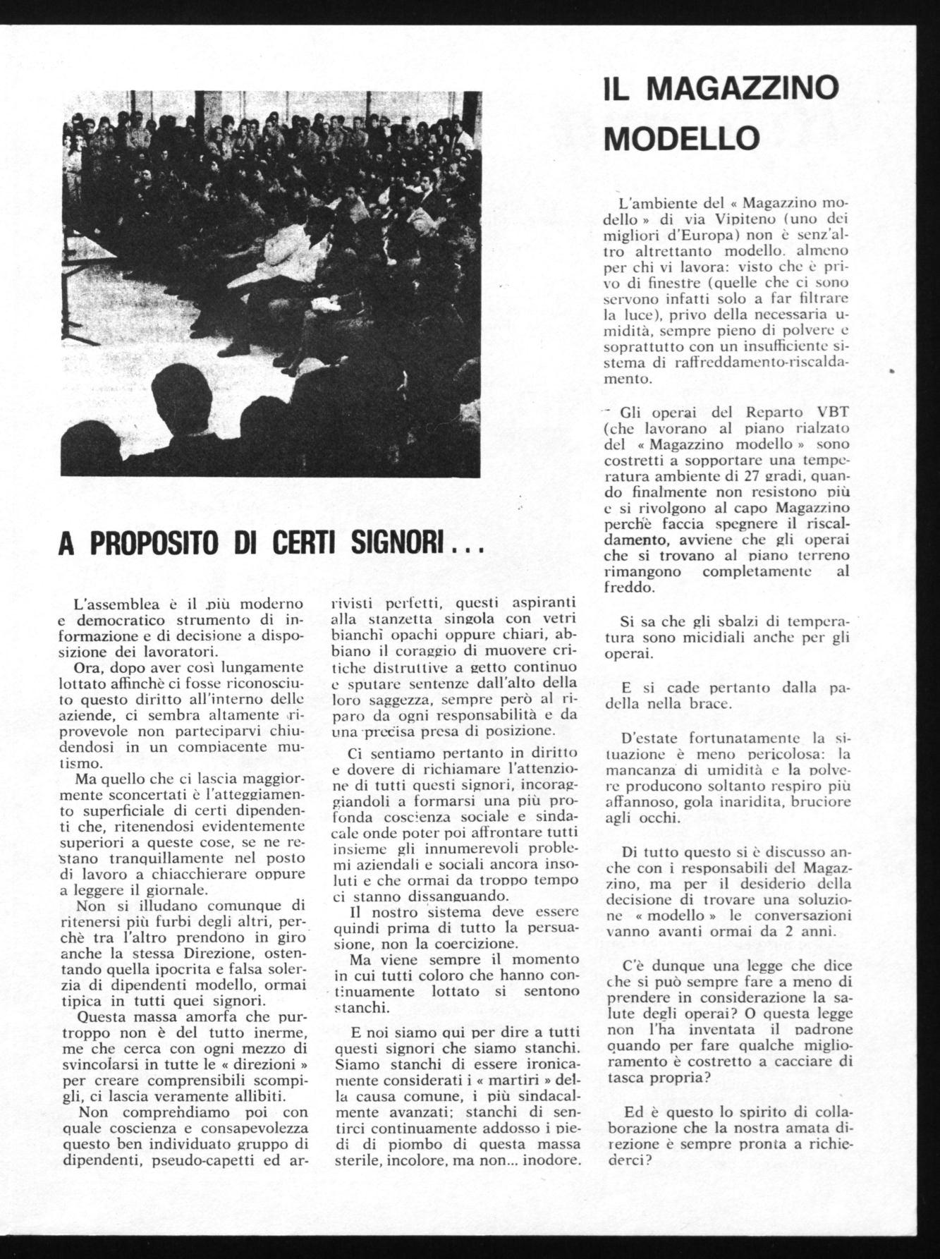 L'ambiente del « Magazzino modello » di via Vipiteno (uno dei migliori d'Europa) non è senz'altro altrettanto modello. almeno per chi vi lavora: visto che è privo di finestte (quelle che ci sono servono infatti solo a far filtrare la luce), privo della necessaria umidità , sempre pieno di polvere e soprattutto con un insufficiente sistema di raffreddamento-riscaldamento.