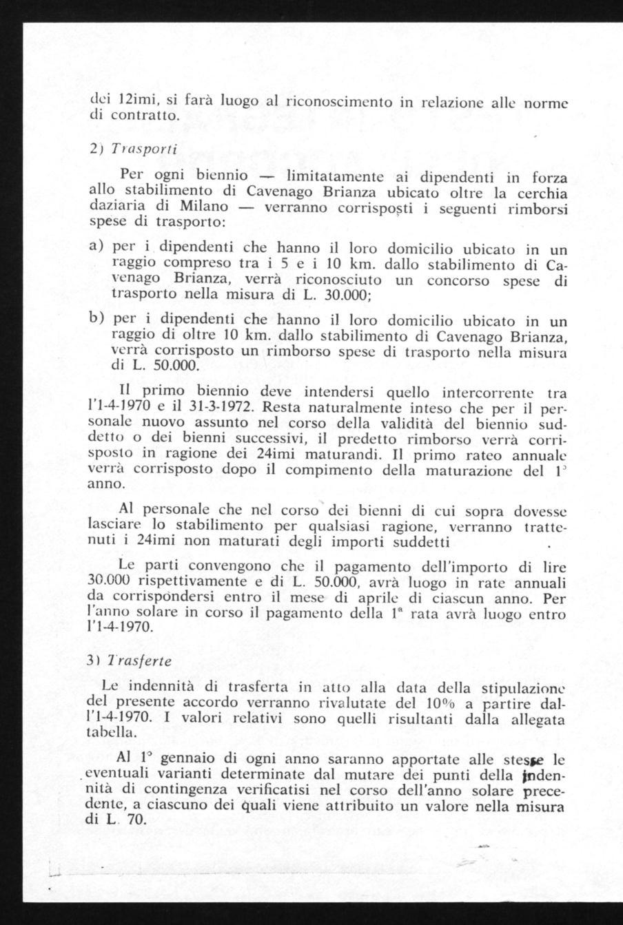per i dipendenti che hanno il loro domicilio ubicato in un raggio compreso tra i 5 e i 10 km. dallo stabilimento di Cavenago Brianza, verrà riconosciuto un concorso spese di trasporto nella misura di L. 30.000;