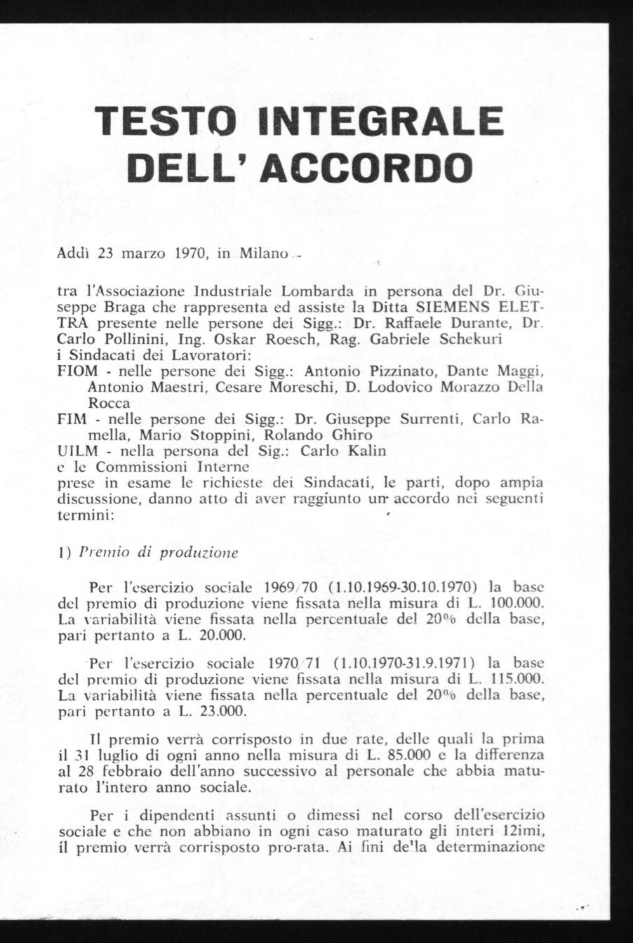 Addì 23 marzo 1970, in Milanotra l'Associazione Industriale Lombarda in persona del Dr. Giuseppe Braga che rappresenta ed assiste la Ditta SIEMENS ELETTRA presente nelle persone dei Sigg.: Dr. Raffaele Durante, Dr. Carlo Pollinini, Ing. Oskar Roesch, Rag. Gabriele Schekuri i Sindacati dei Lavoratori: