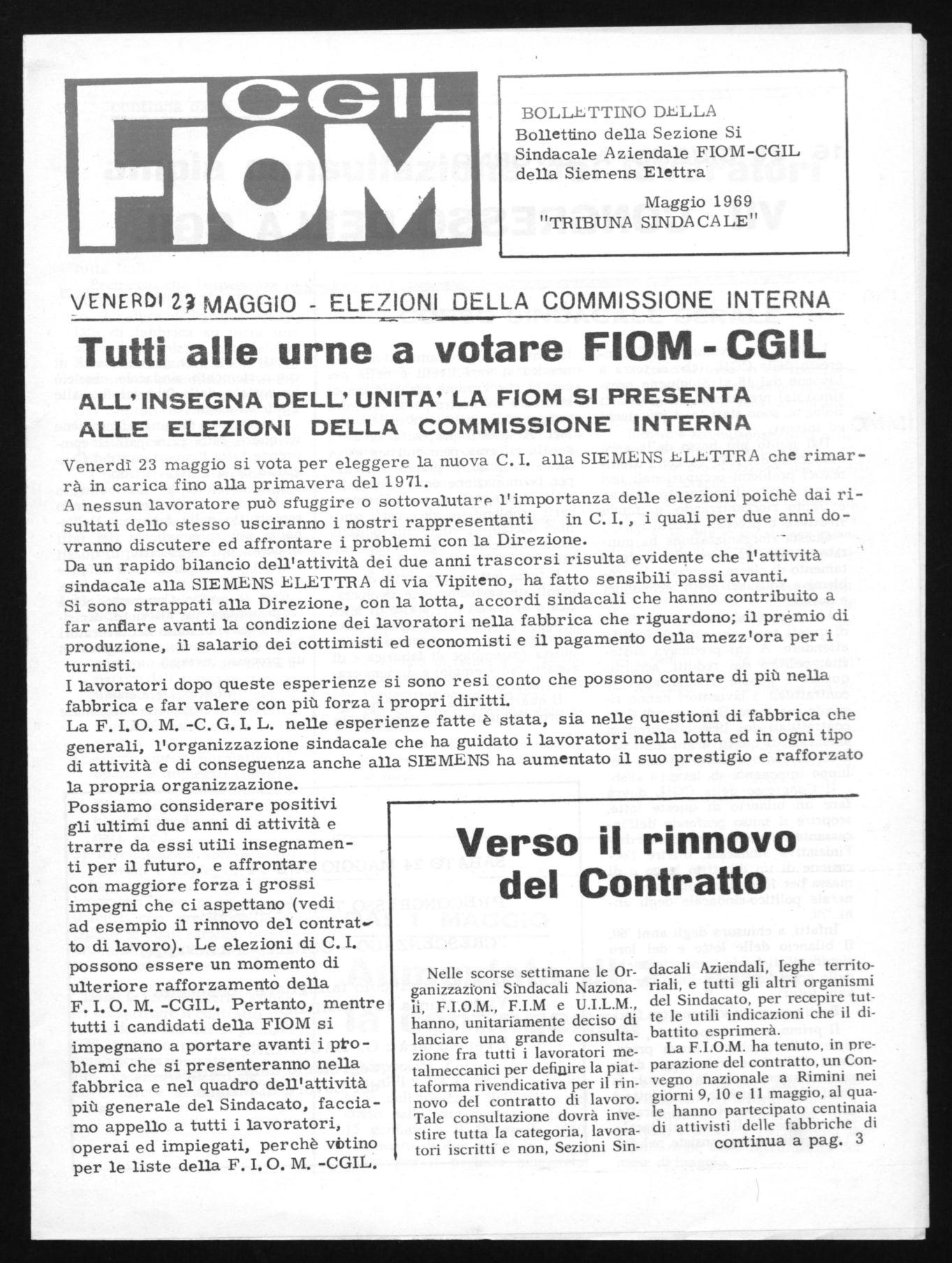 Venerdì 23 maggio si vota per eleggere la nuova C. I. alla SIEMENS ELETTRA che rimarrà in carica fino alla primavera del 1971.