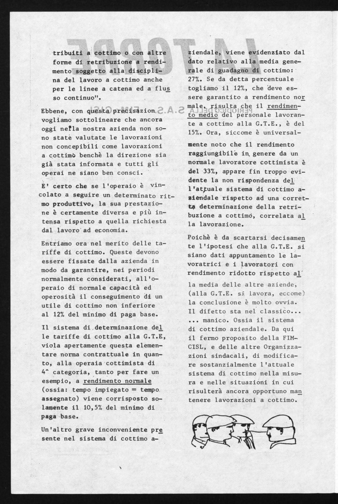 Poichè è da scartarsi decisamen te l'ipotesi che alla G.T.E. si siano dati appuntamento le lavoratrici e i lavoratori con rendimento ridotto rispetto al la media delle altre aziende, (alla G.T.E. si lavora, eccome) la conclusione è molto ovvia. Il difetto sta nel classico... manico. Ossia il sistema di cottimo aziendale. Da qui il fermo proposito della FIMCISL, e delle altre Organizzazioni sindacali, di modificare sostanzialmente l'attuale sistema di cottimo nella misura e nelle situazioni in cui risulterà ancora opportuno man tenere lavorazioni a cottimo.