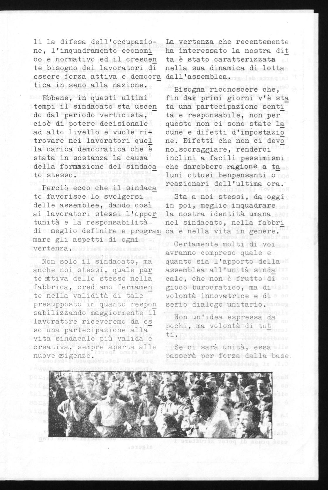 Certamente molti di voi avranno compreso quale e Non solo il sindacato, ma quanto sia l'apporto della anche noi stessi, quale par assemblea all'unità sinda tettiva dello stesso nella cale, che non è frutto di fabbrica, crediamo fermamen gioco burocratico, ma di te nella validità di tale volontà innovatrice e di presupposto in quanto respon serio dialogo unitario. sabilizzando maggiormente il lavoratore riceveremo da es so una partecipazione alla vita sindacale più valida e creativa, sempre aperta alle nuove esigenze.