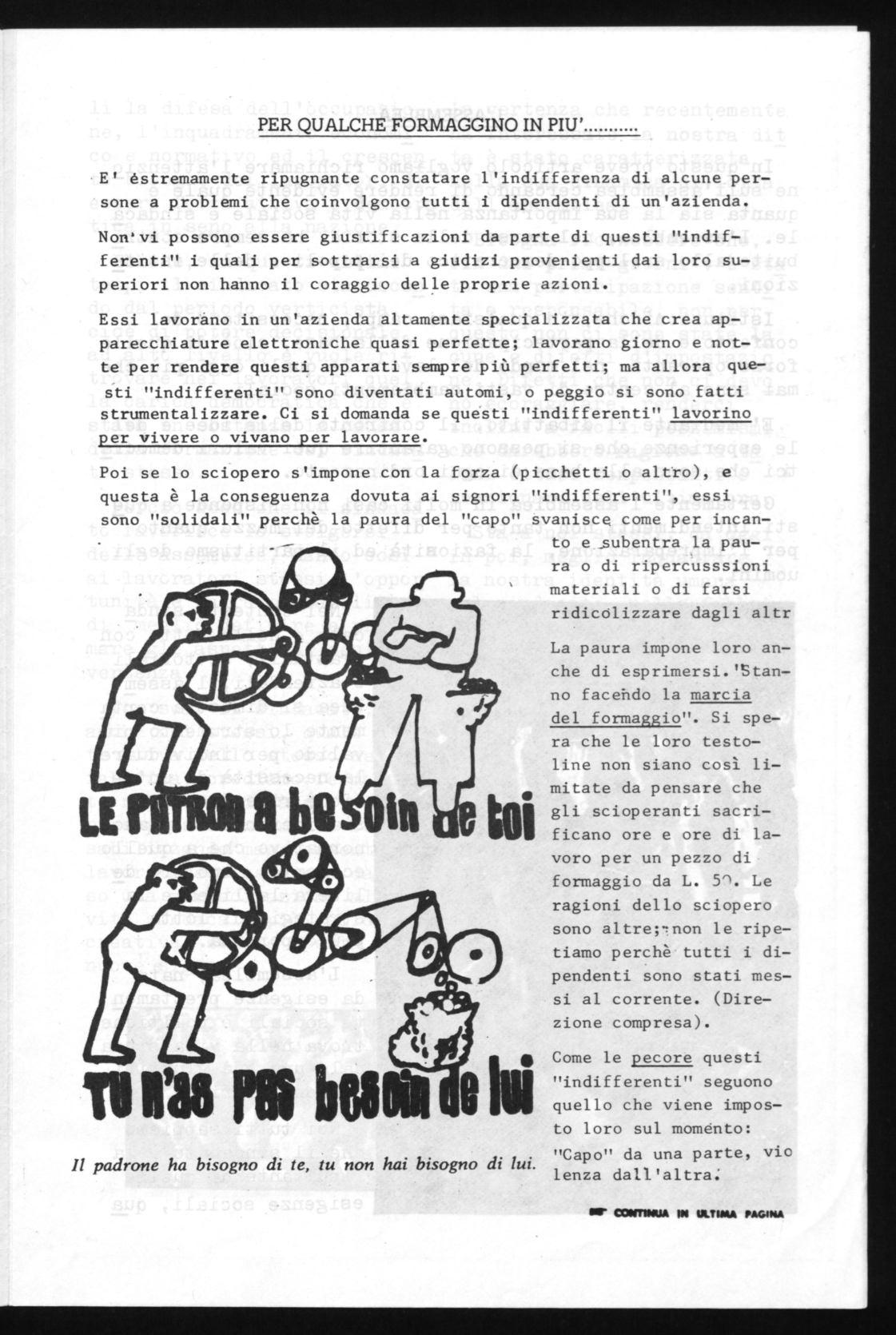 La paura impone loro anche di esprimersi.'Stanno facehdo la marcia del formaggio". Si spera che le loro testoline non siano così limitate da pensare che gli scioperanti sacrificano ore e ore di lavoro per un pezzo di formaggio da L. 5'. Le ragioni dello sciopero sono altre;',non le ripetiamo perchè tutti i dipendenti sono stati messi al corrente. (Direzione compresa).