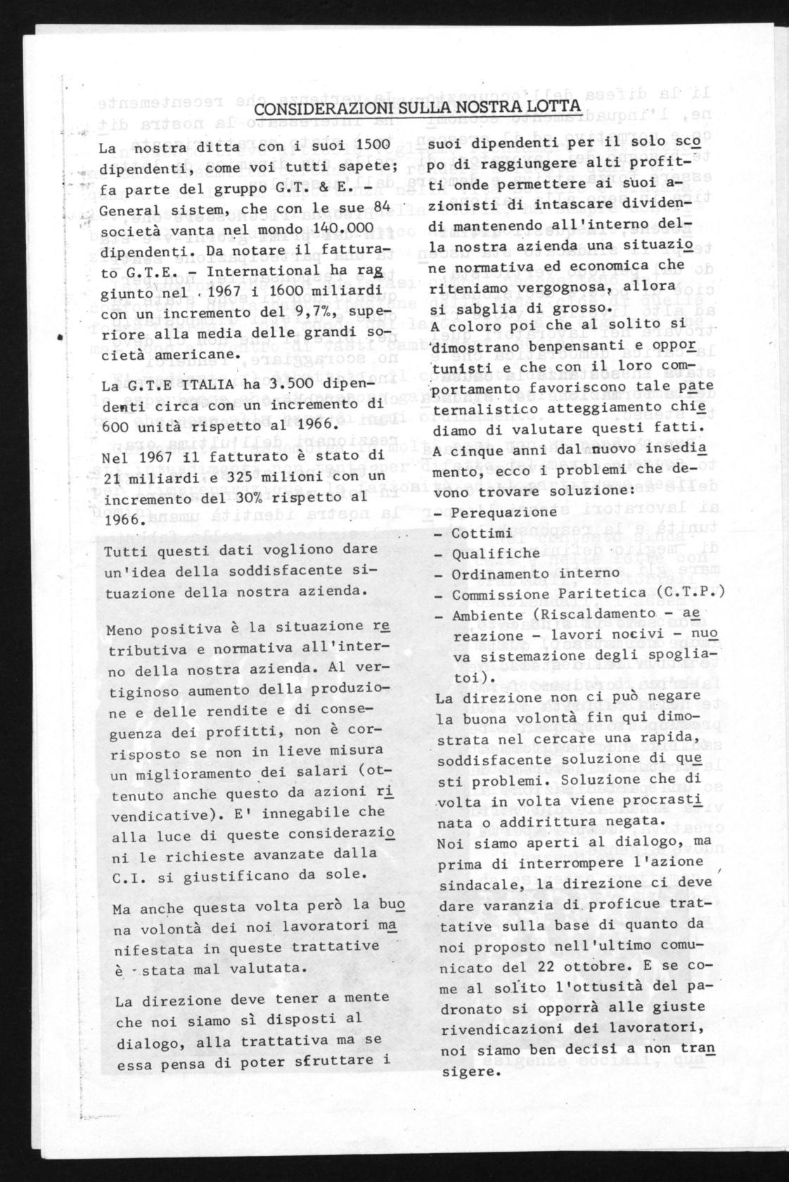 La nostra ditta con i suoi 1500 dipendenti, come voi tutti sapete; fa parte del gruppo G.T. & E. — General sistem, che con le sue 84 società vanta nel mondo 140.000 dipendenti. Da notare il fattura— to G.T.E. — International ha rag giunto nel ,1967 i 1600 miliardi con un incremento del 9,7%, supe— riore alla media delle grandi so— cietà americane.