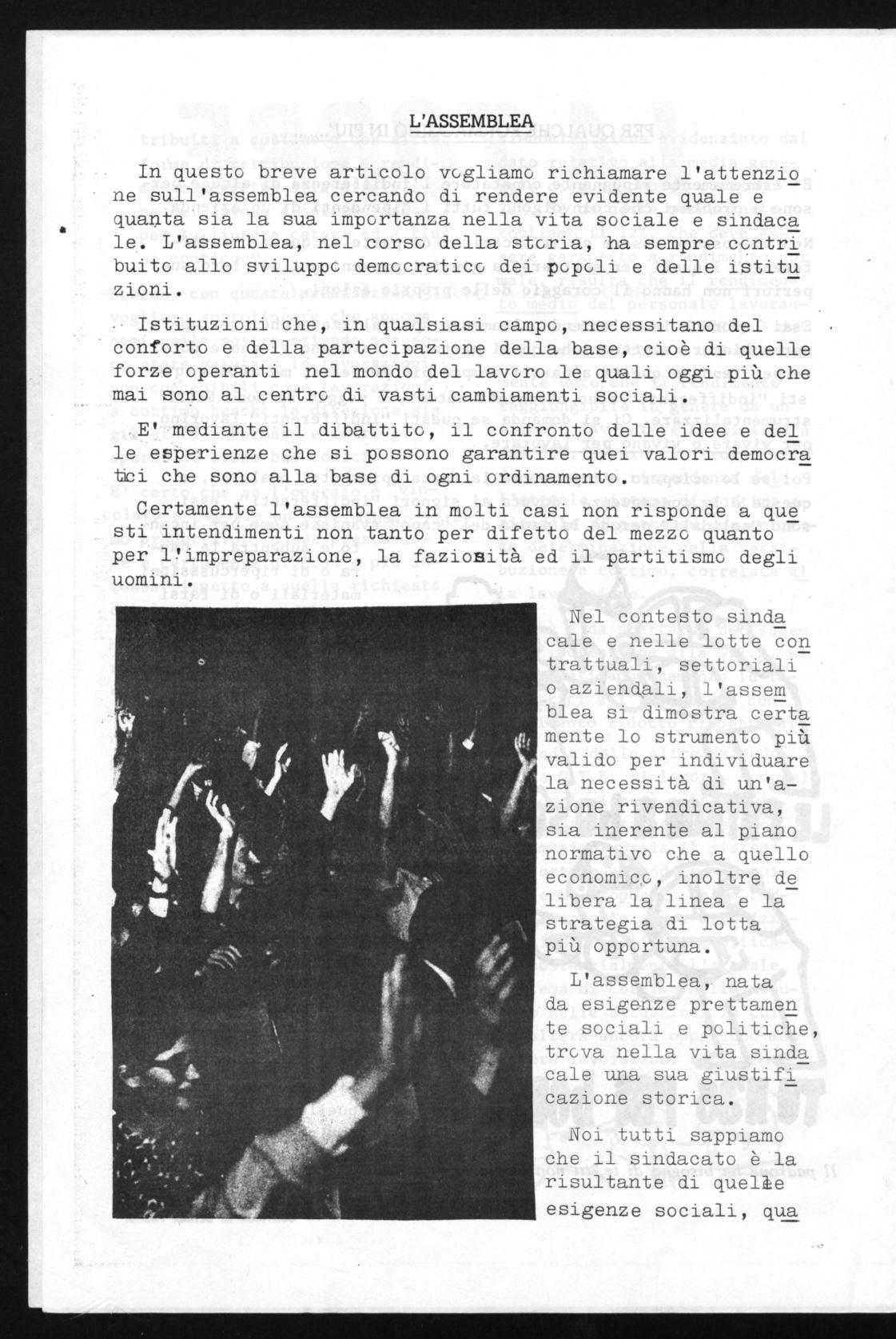 Nel contesto sinda cale e nelle lotte con trattuali, settoriali o aziendali, l'assem blea si dimostra certa mente lo strumento più valido per individuare la necessità di un'azione rivendicativa, sia inerente al piano normativo che a quello economico, inoltre de libera la linea e la strategia di lotta più opportuna.