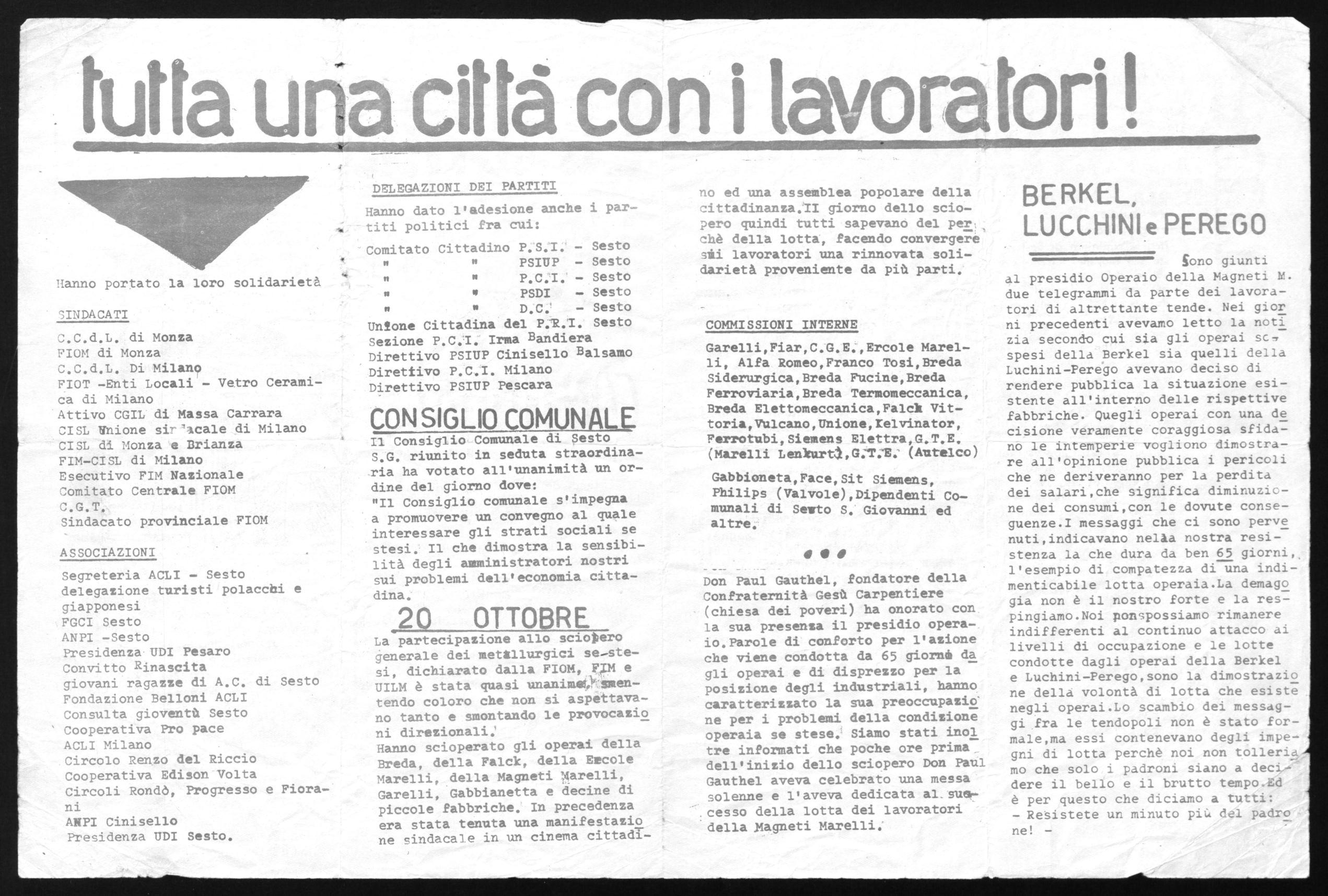 Don Paul Gauthel, fondatore della Confraternità Gesù Carpentiere (chiesa dei poveri) ha onorato con la sua presenza il presidio operaio.Parole di conforto per l'azione che viene condotta da 65 giornè da gli operai e di disprezzo per la posizione degli industriali, hanno caratterizzato la sua preoccupazio' ne per i problemi della condizione operaia se stese. Siamo stati inol tre informati che poche ore prima dell'inizio dello sciopero Don Paul Gauthel aveva celebrato una messa solenne e l'aveva dedicata al.suel.cesso della lotta dei lavoratori della Magneti Marelli.