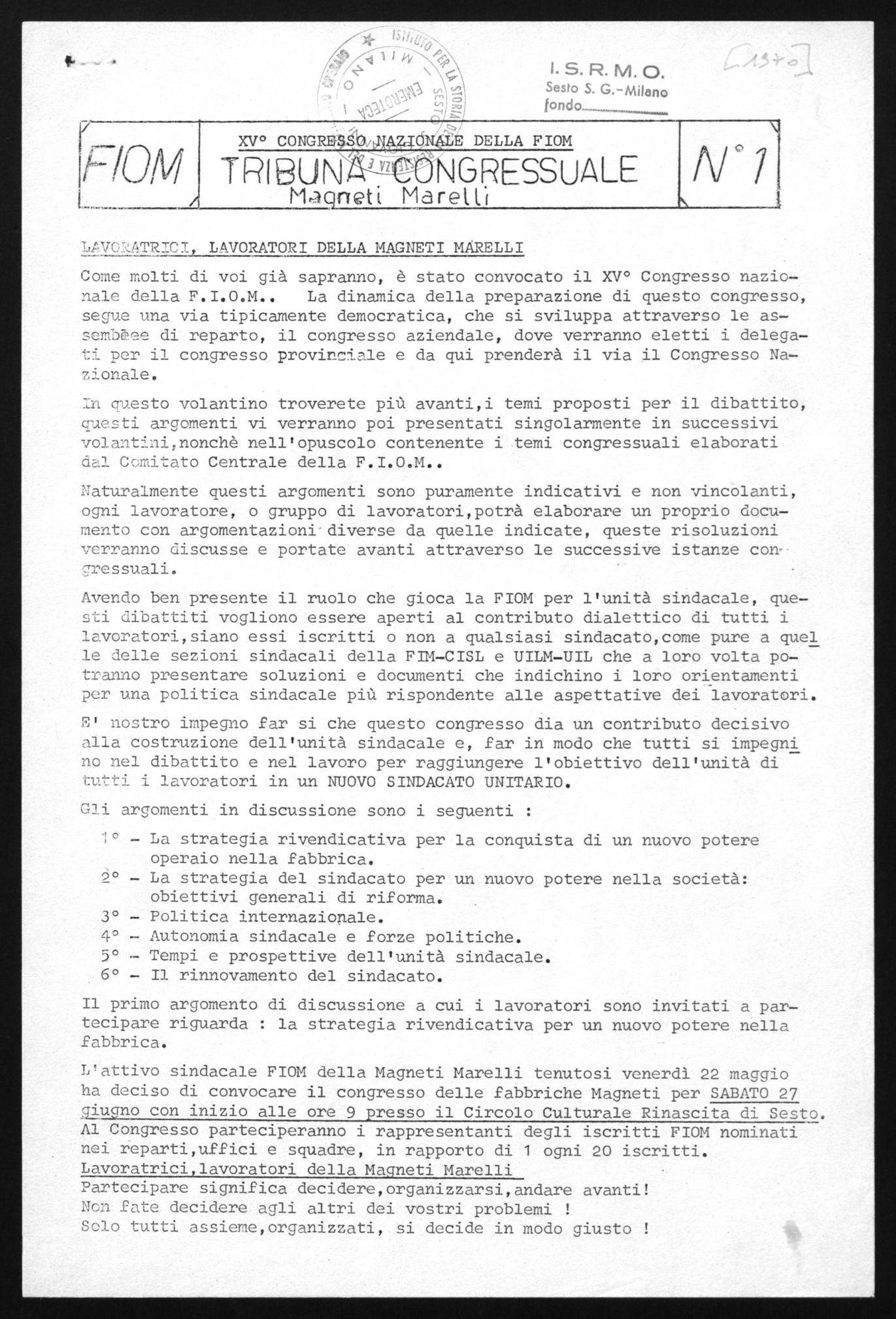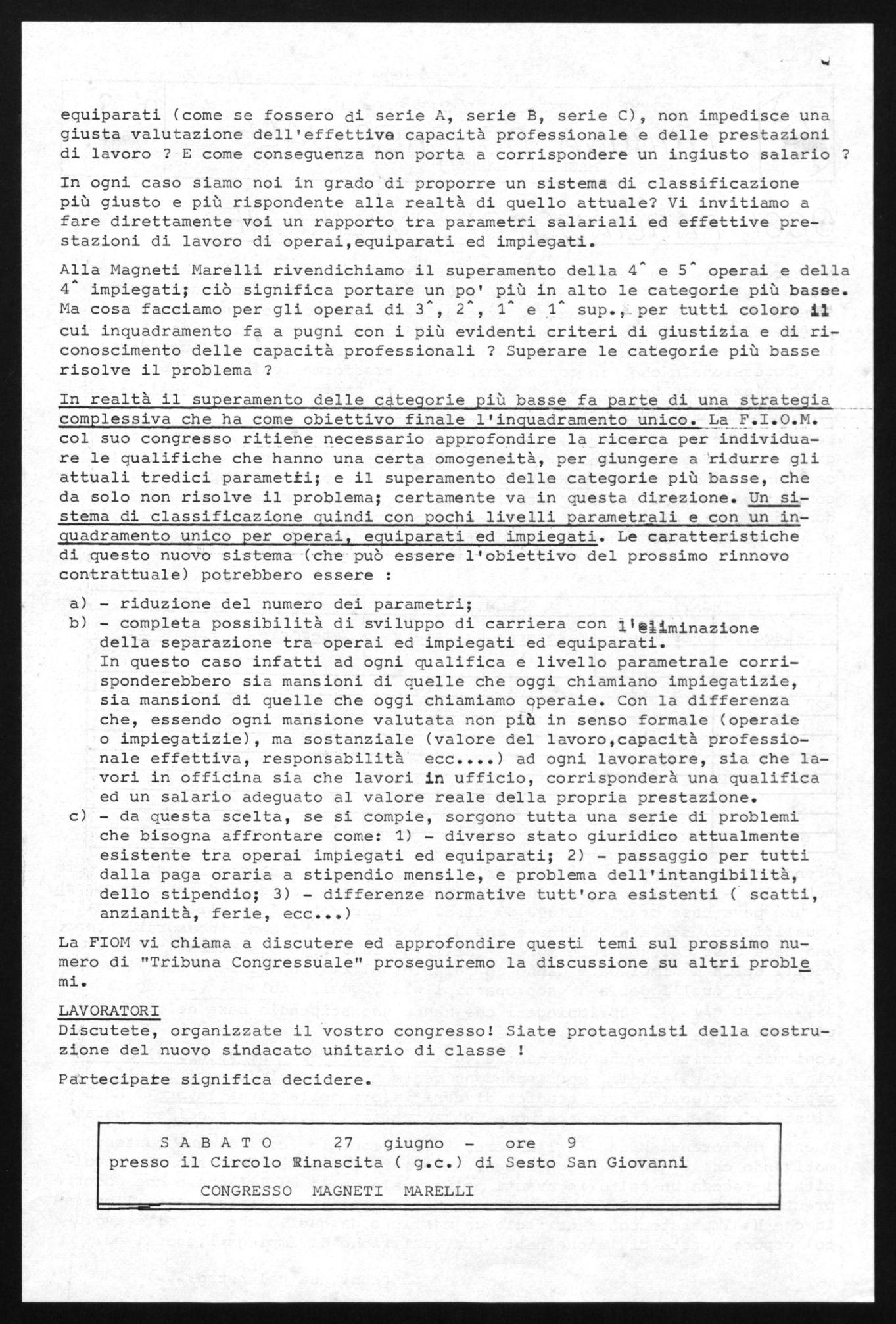 Avendo ben presente il ruolo che gioca la FIOM per l'unità sindacale, questi dibattiti vogliono essere aperti al contributo dialettico di tutti i lavoratori,siano essi iscritti o non a qualsiasi sindacato,come pure a quel le delle sezioni sindacali della FIM-CISL e UILM-UIL che a loro volta potranno presentare soluzioni e documenti che indichino i loro orientamenti per una politica sindacale più rispondente alle aspettative dei lavoratori.