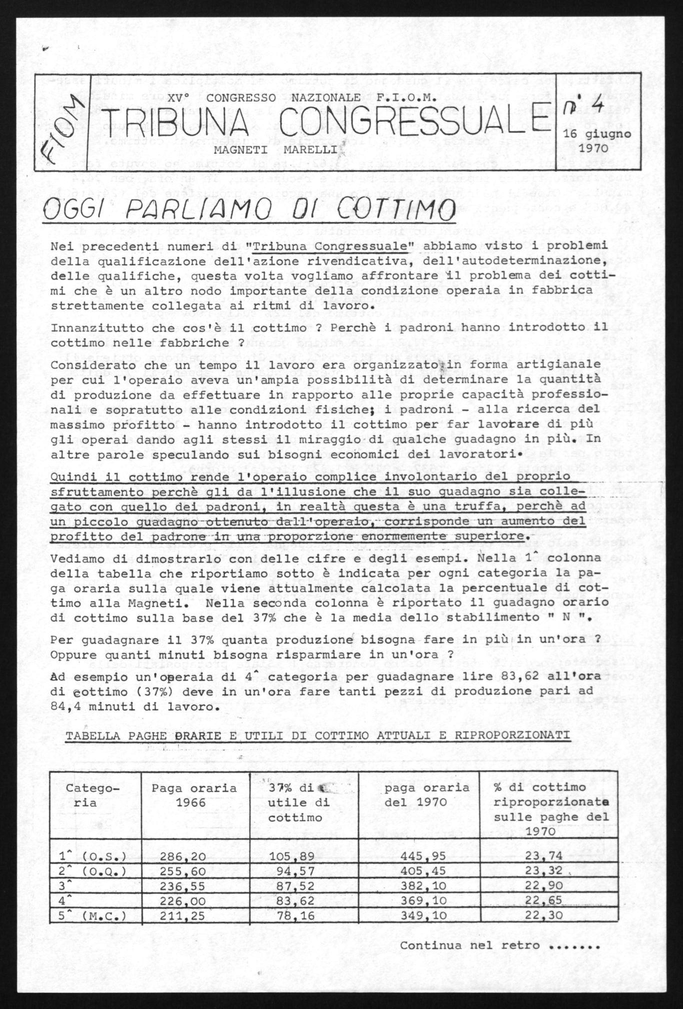 Nei precedenti numeri di "Tribuna Congressuale" abbiamo visto i problemi della qualificazione dell'azione rivendicativa, dell'autodeterminazione, delle qualifiche, questa volta vogliamo affrontare il problema dei cottimi che è un altro nodo importante della condizione operaia in fabbrica strettamente collegata ai ritmi di lavoro.