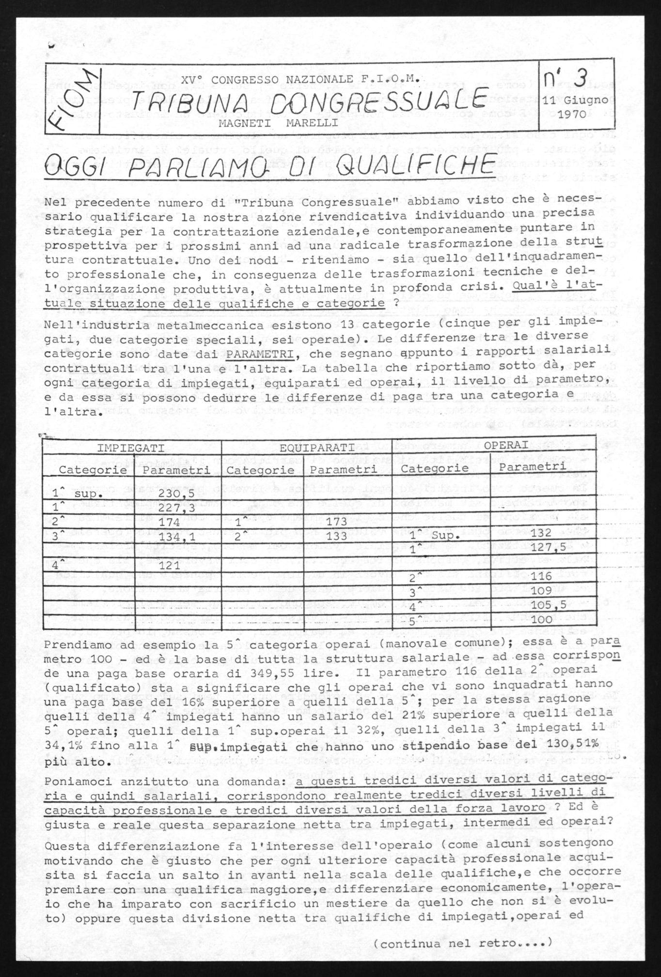 Poniamoci anzitutto una domanda: a questi tredici diversi valori di categoria e quindi salariali, corrispondono realmente tredici diversi livelli di capacità professionale e tredici diversi valori della forza lavoro ? Ed è giusta e reale questa separazione netta tra impiegati, intermedi ed operai? Questa differenziazione fa l'interesse dell'operaio (come alcuni sostengono motivando che è giusto che per ogni ulteriore capacità professionale acquisita si faccia un salto in avanti nella scala delle qualifiche,e che occorre premiare con una qualifica maggiore,e differenziare economicamente, l'operaio che ha imparato con sacrificio un mestiere da quello che non si è evoluto) oppure questa divisione netta tra qualifiche di impiegati,operai ed