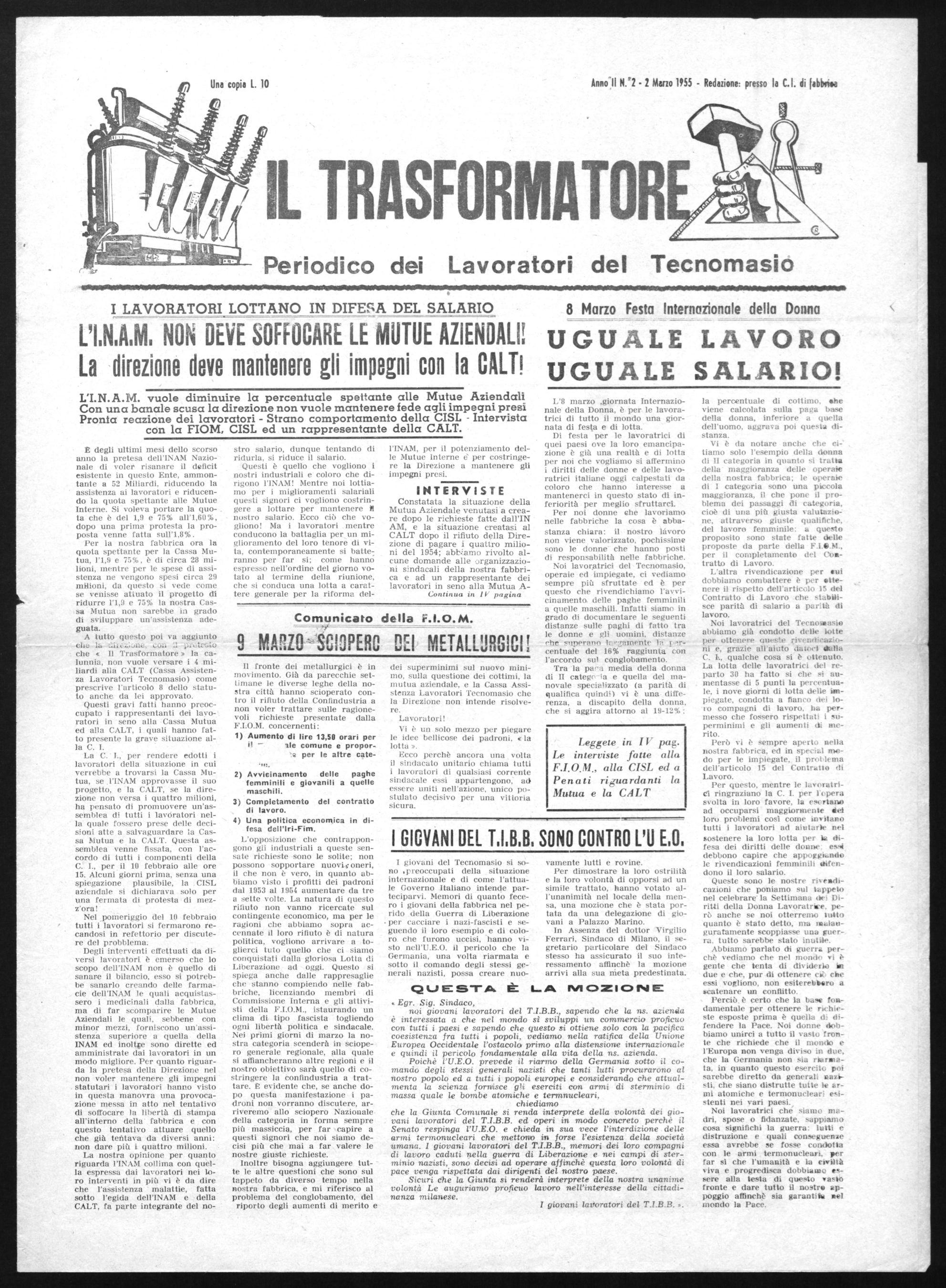 Una copia L. 10 Anno II N:1 - 1 Marzo 1955 - Redazione: presso la C.I. di labbri« C IL TRASFORMATOR Periodico dei Lavoratori del Tecnomasio 11111.11110.11111111011.10 NUL -.od Abill~11111011111uMgmeglaras I LAVORATORI LOTTANO IN DIFESA DEL SALARIO 8 Marzo Festa Internazionale della Donna NON DEVE SOFFOCARE LE MUTUE AZIENDALI!u G U A L E LAVORO la direzione deve mantenere gli impegnicon la CALT! UGUALE SALARIO!