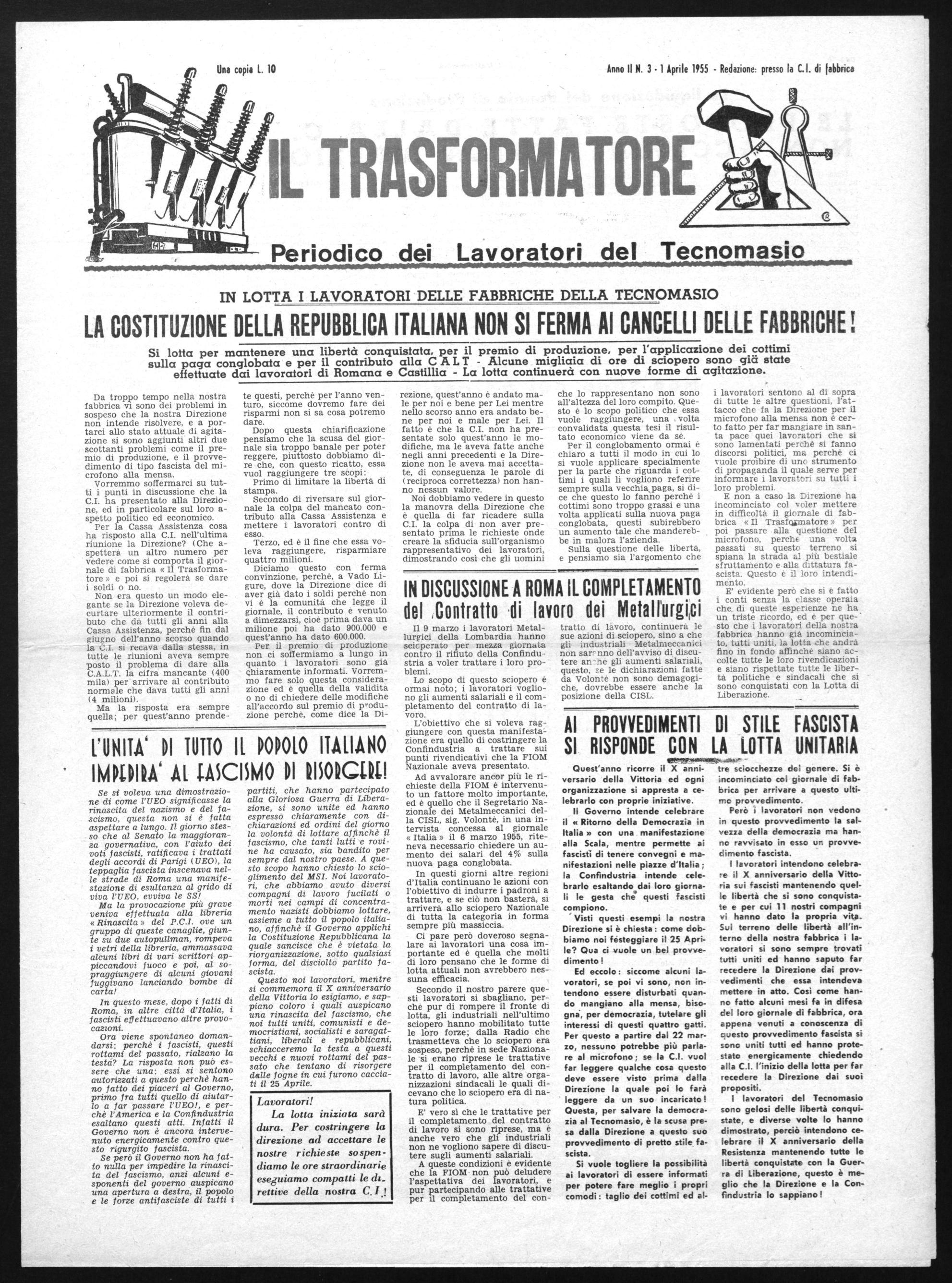 I lavoratori intendono celebrare il X anniversario della Vittoria sui fascisti mantenendo quelle libertà che si sono conquistate e per cui 11 nostri compagni vi hanno dato la propria vita. Sul terreno delle libertà all'interno della nostra fabbrica i lavoratori si sono sempre trovati tutti uniti ed hanno saputo far recedere la Direzione dai provvedimenti che essa intendeva mettere in atto. Così come hanno fatto alcuni mesi fa in difesa del loro giornale di fabbrica, ora appena venuti a conoscenza di questo provvedimento fascista si sono uniti tutti ed hanno protestato energicamente chiedendo alla C.I. l'inizio della lotta per far recedere la Direzione dai suoi propositi.