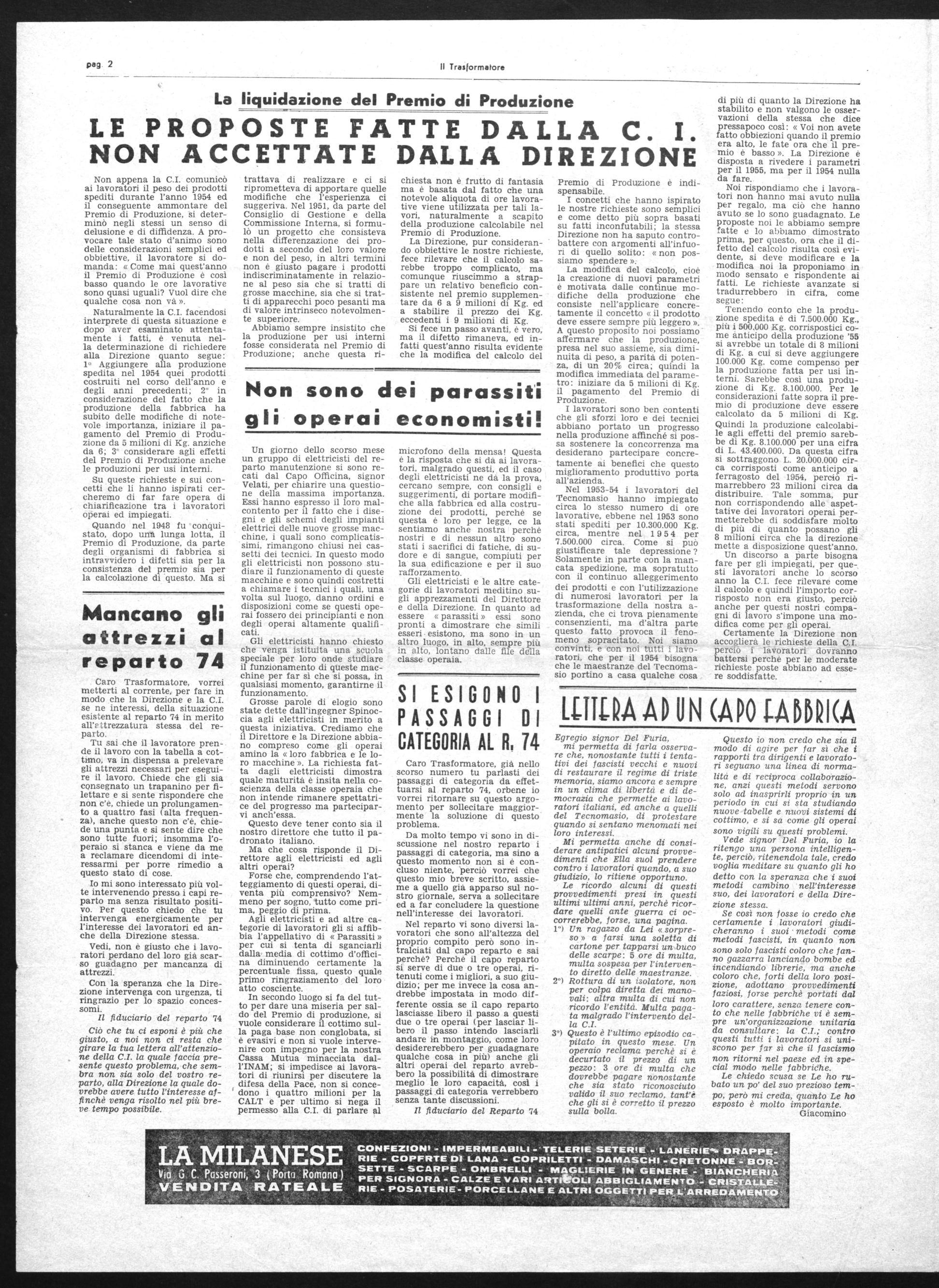 Nel 1953-54 i lavoratori del Tecnomasio hanno impiegato circa lo stesso numero di ore lavorative, ebbene nel 1953 sono stati spediti per 10.300.000 Kg. circa, mentre nel 1 9 5 4 per 7.500.000 circa. Come si può giustificare tale depressione ? Solamente in parte con la mancata spedizione, ma sopratutto con il continuo alleggerimento dei prodotti e con l'utilizzazione di numerosi lavoratori per la trasformazione della nostra azienda, che ci trova pienamente consenzienti, ma d'altra parte questo fatto provoca il fenomeno sopracitato. Noi siamo convinti, e con noi tutti i lavoratori, che per il 1954 bisogna che le maestranze del Tecnomasio portino a casa qualche cosa