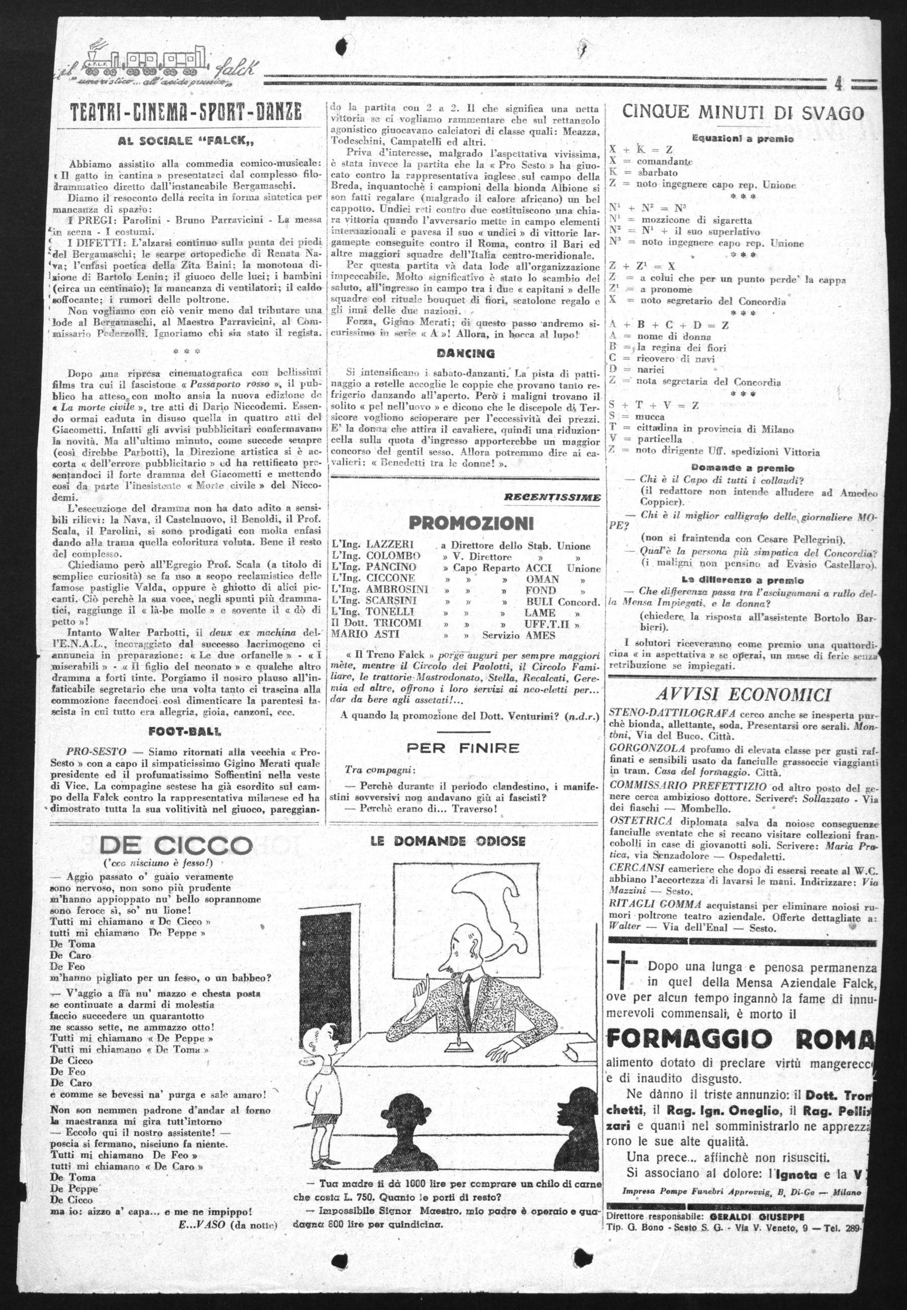 Il Treno Falck » porge-auguri per sempre maggiori mete, mentre il Circolo dei Paolotti, il Circolo Familiare, le trattorie- Mastrodonato, Stella, Recalcati, Geremia ed altre, offrono i loro servizi ai neo-eletti per... dar da bere agli assetati!...