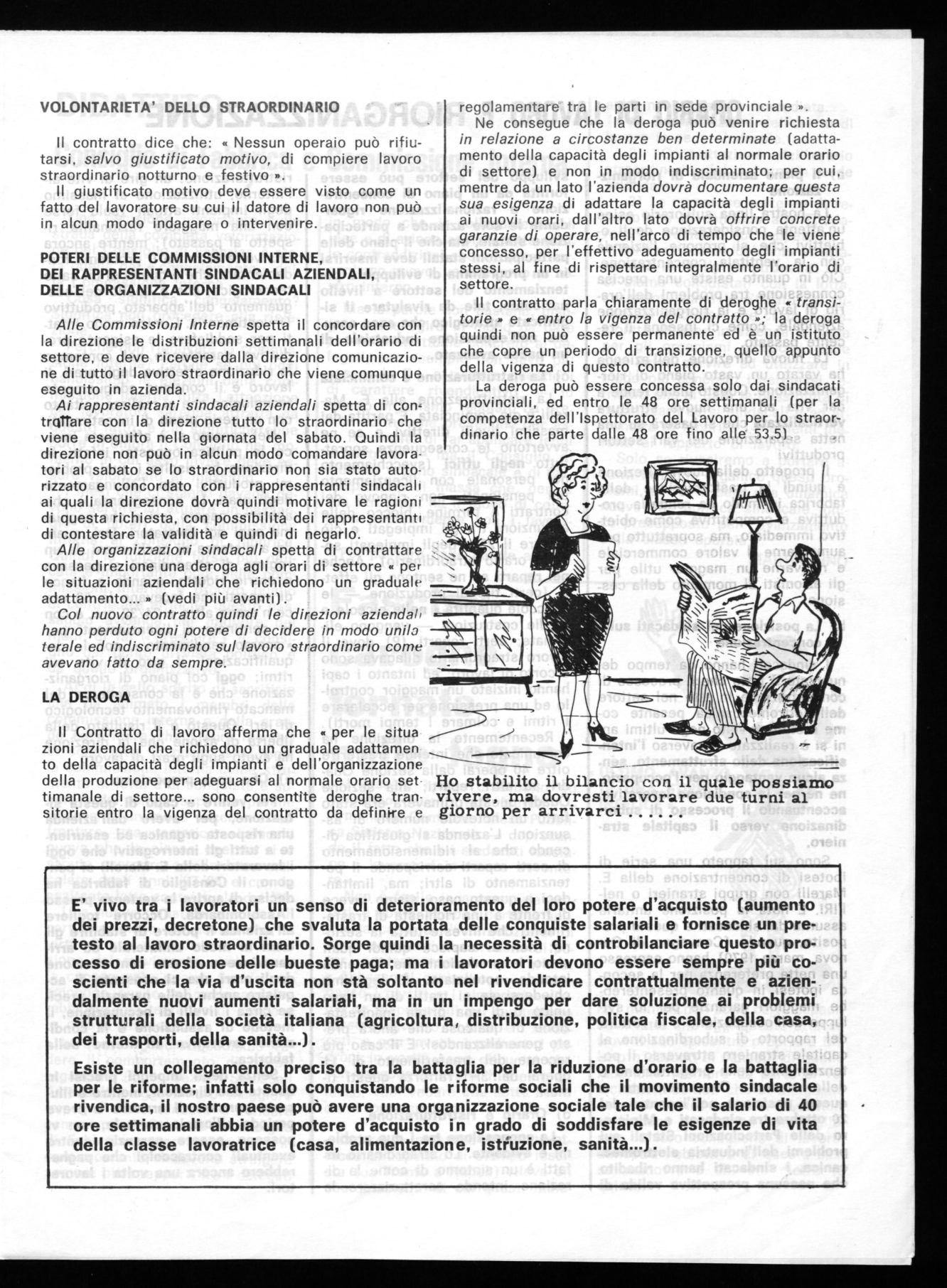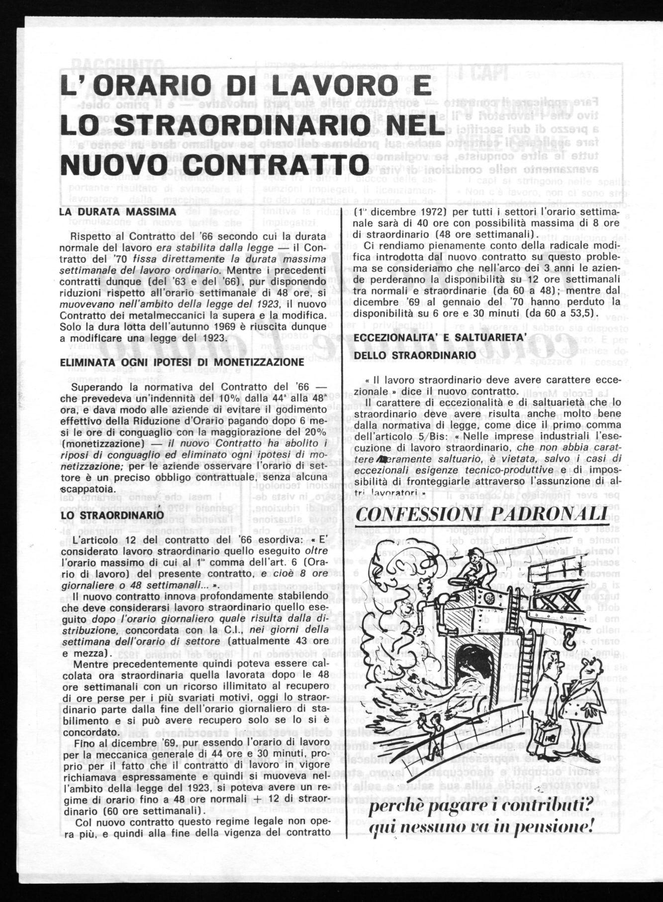 Ci rendiamo pienamente conto della radicale modifica introdotta dal nuovo contratto su questo problema se consideriamo che nell'arco dei 3 anni le aziende perderanno la disponibilità su 12 ore settimanali tra normali e straordinarie (da 60 a 48); mentre dal dicembre '69 al gennaio del '70 hanno perduto la disponibilità su 6 ore e 30 minuti (da 60 a 53,5).