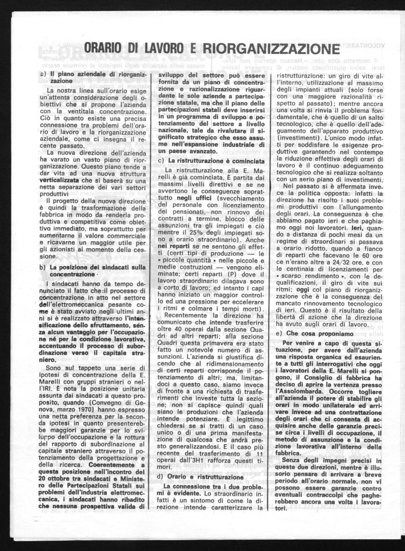 Per venire a capo di questa situazione, per avere dall'azienda una risposta organica ed esauriente a tutti gli interrogativi che oggi i lavoratori della E. Marelli si pongono, il Consiglio di fabbrica ha deciso di aprire la vertenza presso l'Assolombarda. Occorre togliere all'azienda il potere di stabilire gli orari in modo unilaterale ed arrivare invece ad una contrattazione degli orari che ci consenta di acquisire anche delle garanzie precise circa i livelli di occupazione, il metodo di assunzione e la condizione lavorativa all'interno della fabbrica.