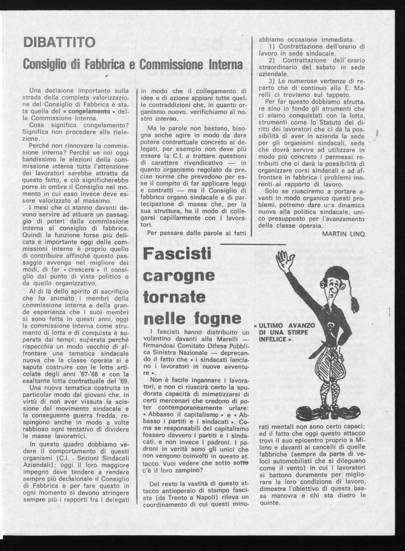 Al di là dello spirito di sacrificio che ha animato i membri della ccmmissione interna e della grande esperienza che i suoi membri si sono fatta in questi anni, oggi la commissione interna come strumento di lotta e di conquista è superata dai tempi; superata perché rispecchia un modo vecchio di affrontare una tematica sindacale nuova che la classe operaia si è saputa costruire con le lotte articolate degli anni '67-'68 e con la esaltante lotta contrattuale del '69.