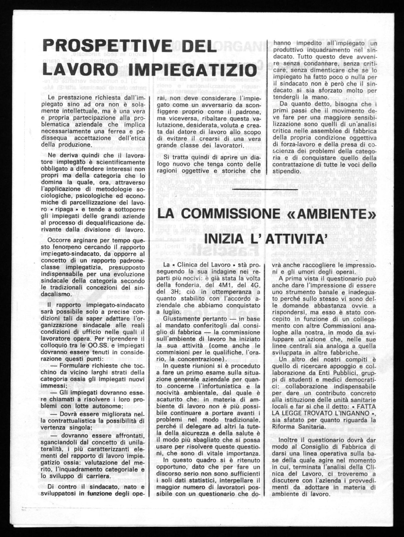 Inoltre il questionario dovrà dar modo al Consiglio di Fabbrica di darsi una linea operativa sulla base della quale agire nel momento in cui, terminata l'analisi della Clinica del Lavoro, ci troveremo a discutere con l'azienda i provvedimenti da adottare in materia di ambiente di lavoro.