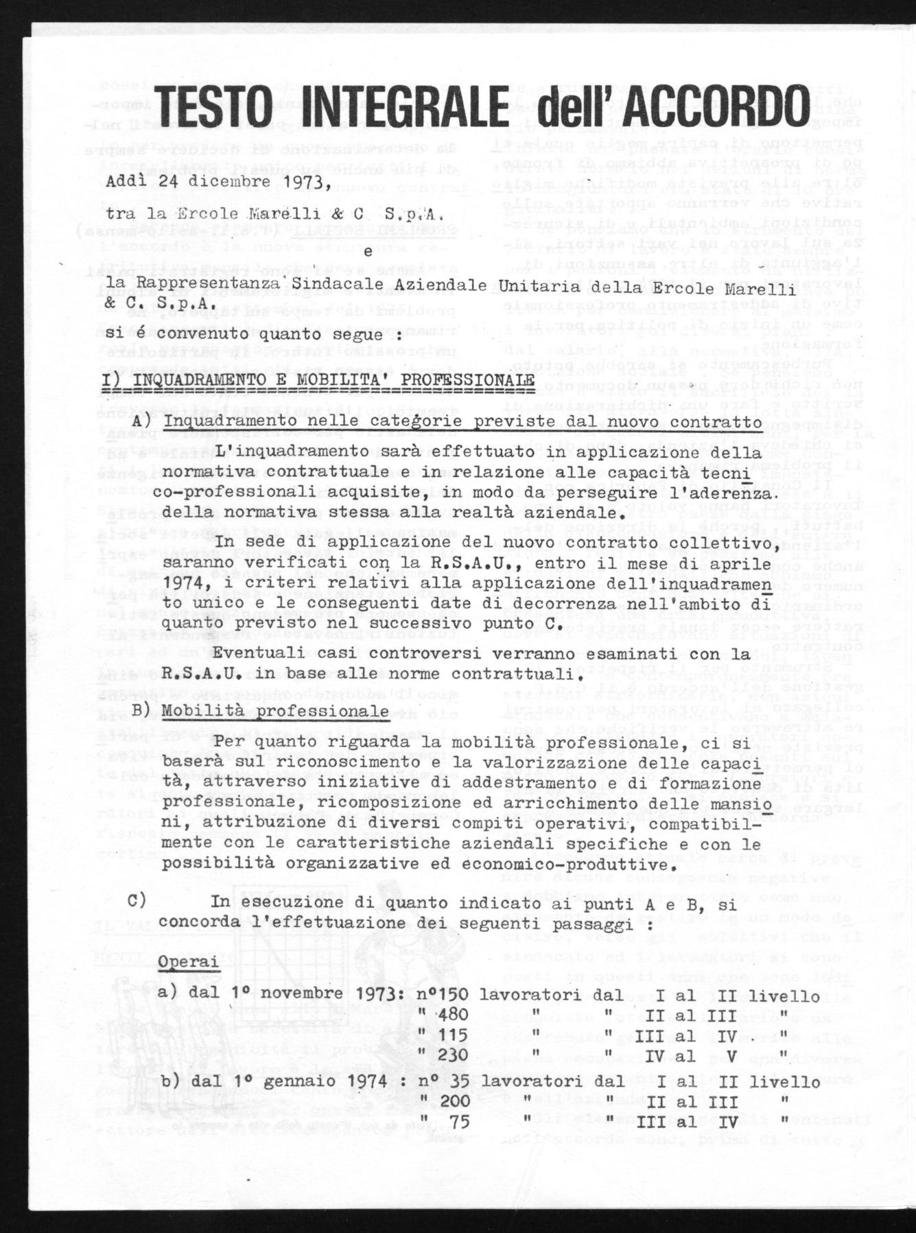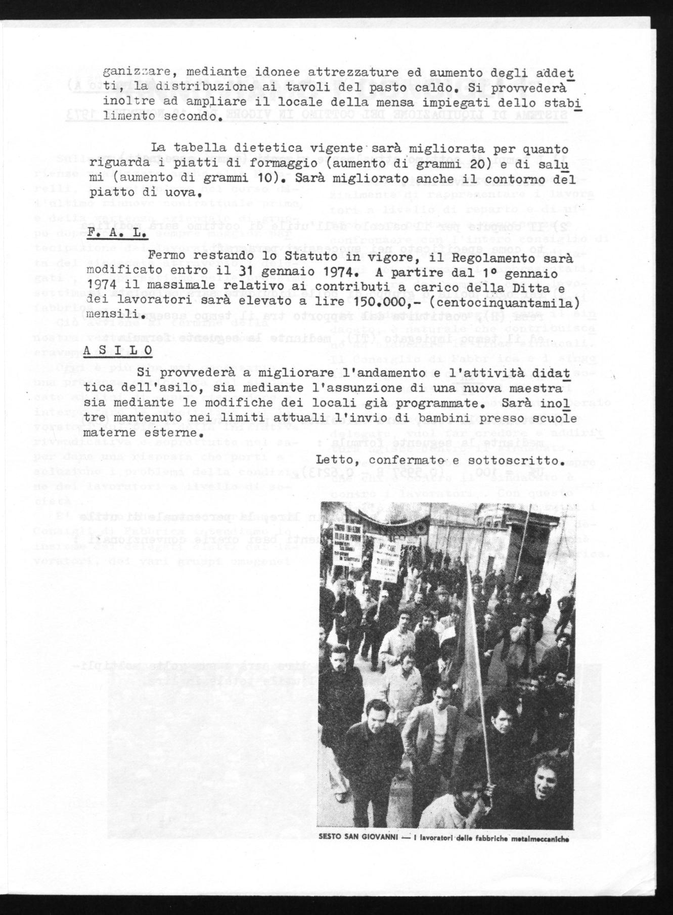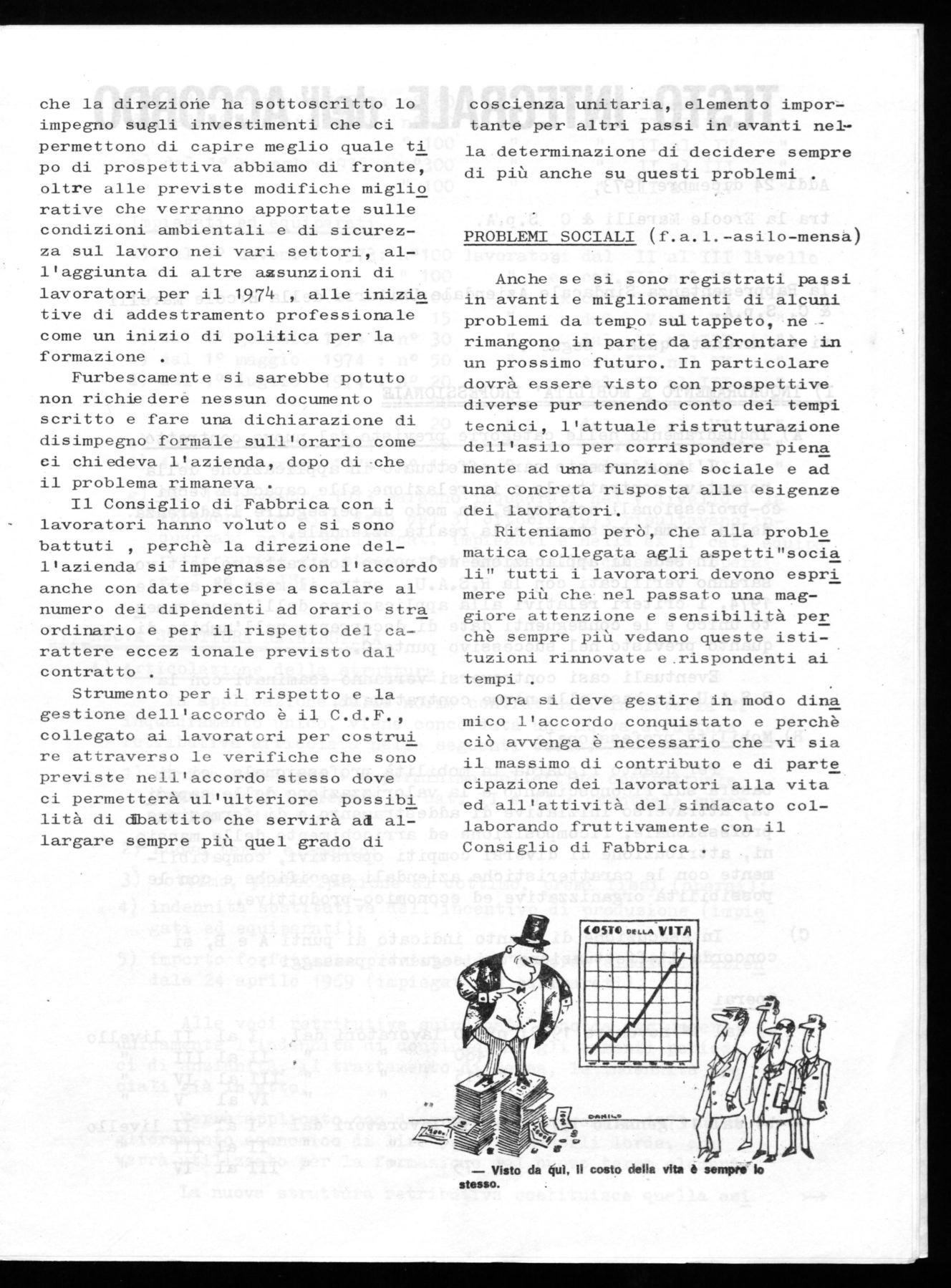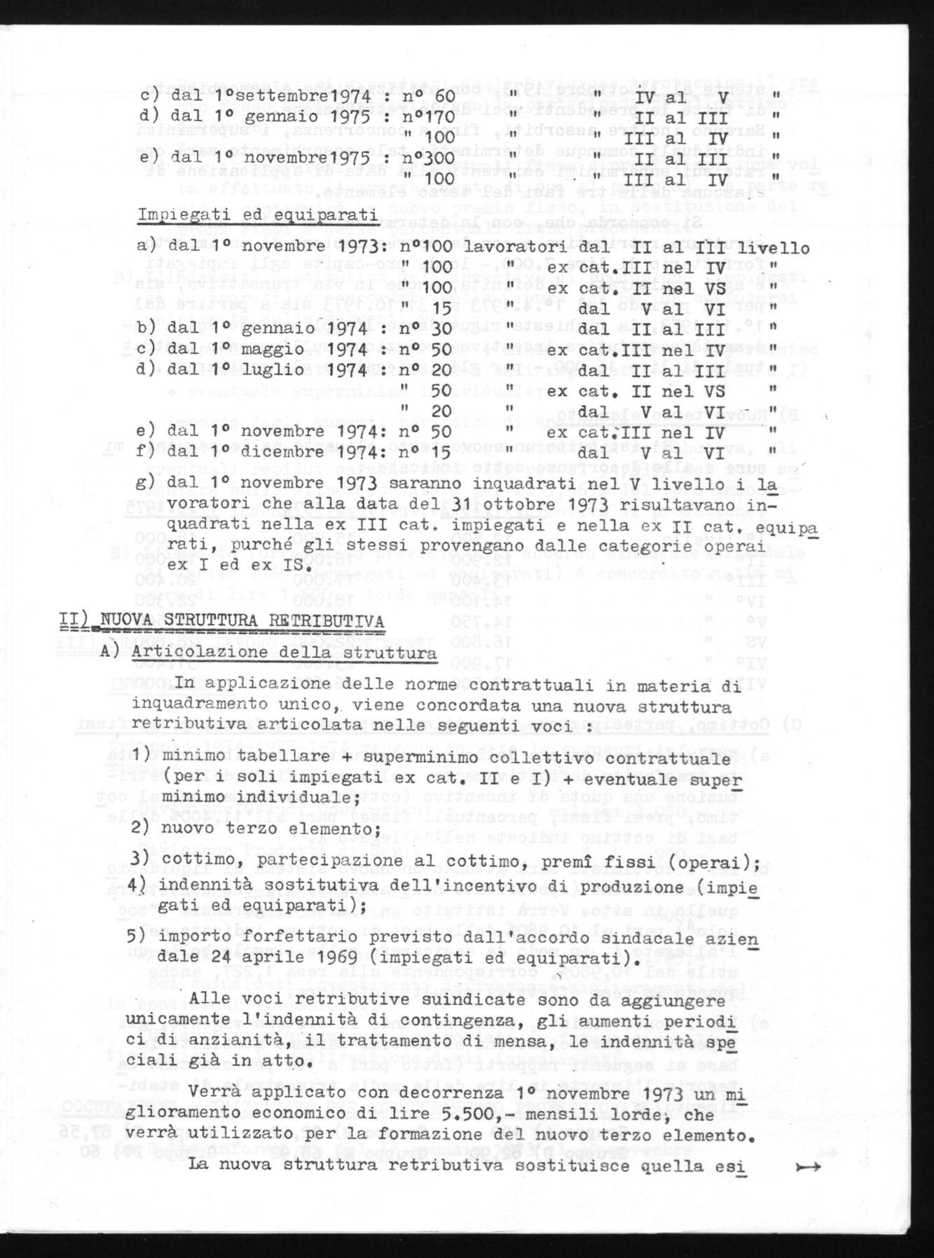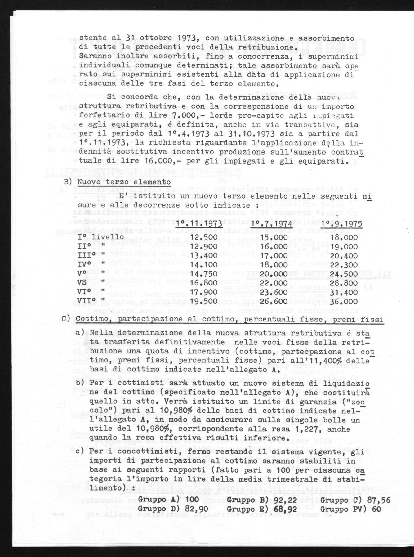 Con questo accordo i lavoratori del 1° livello con il 1° Gennaio 74 pas seranno tutti al 2° livello,quei la voratori che al 31 Ottobre 73 erano in forza, avranno un beneficio minimo di L. 5.500 attraverso il 3° ele mento più altre L. 6.000 derivanti dal passaggio di categoria .
