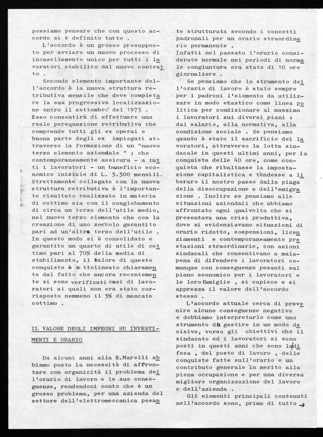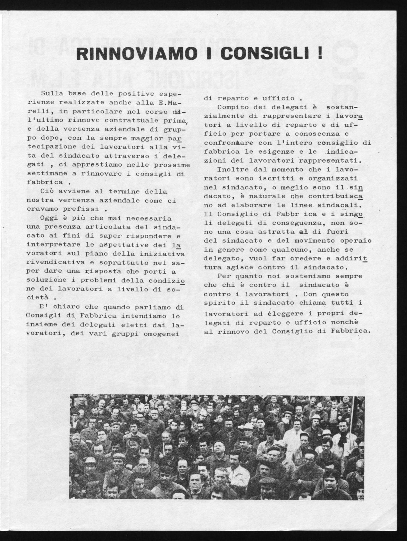 Sulla base delle positive esperienze realizzate anche alla E.Marelli, in particolare nel corso oèll'ultimo rinnovc contrattuale prima, e della vertenza aziendale di gruppo dopo, con la sempre maggior par tecipazione dei lavoratori alla vita del sindacato attraverso i'delegati , ci apprestiamo nelle prossime settimane a rinnovare i consigli di fabbrica .