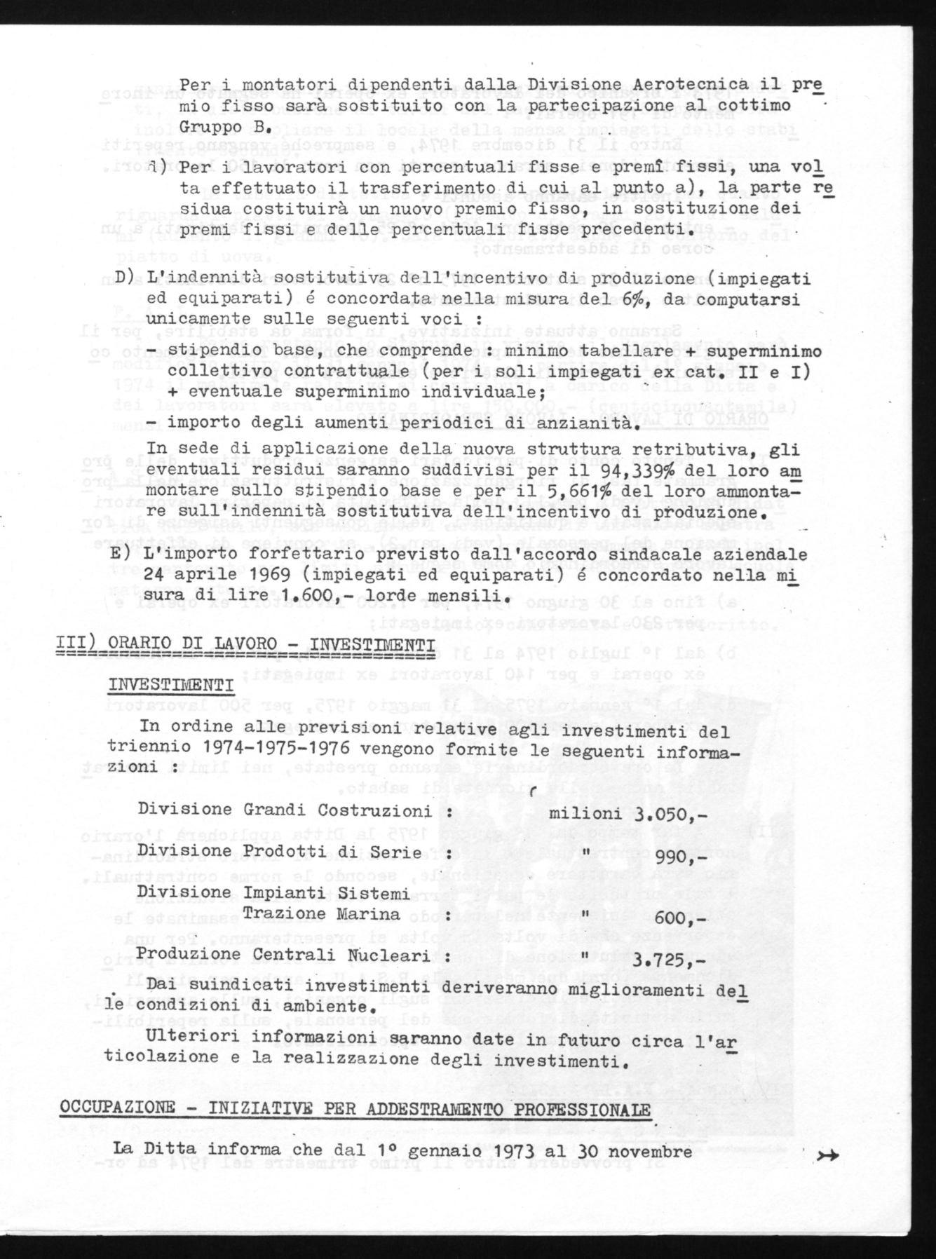 che la direziorie ha sottoscritto lo impegno sugli investimenti che ci permettono di capire meglio quale ti po di prospettiva abbiamo di fronte, oltre alle previste modifiche miglio rative che verranno apportate sulle condizioni ambientali e di sicurezza sul lavoro nei vari settori, all'aggiunta di altre assunzioni di lavoratori per il 1974 alle inizia tive di addestramento professionale come un inizio di poliiica per la formazione .