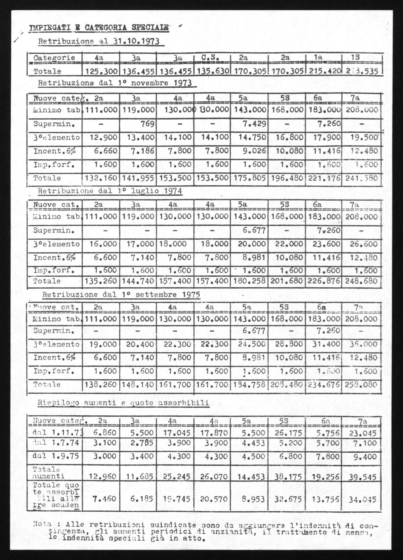 Retribuzione al 31.10.1973 Categorie 4a 3a 2a la 13 l Totale 133.642 137.366 144.236 156.218 160.988 I A Retribuzione dial 1° novembre 1973 - Nuove cate . la 2n 3a 4a 5a , 1 n mo a . 105.000- 111.000 119.000 130.000 143.000 SupermiA.itò 5.878 2.646 - _3° elemento 12.500 12.900 13.400 . 14.100 14.750 Cottimo 15.764 16.320 17.335 19.046 19.724 Totale 139.142 142.566. 149.736 163.146 177.474 Retribuzionedal 1° luglio 1974 211522211e Lr..--m-12 ----._-.t- 2a 3a 4a 5a 1;inimo tab. 105.000 111.000 119.000 130.000 143.000 Superminimo 3.378 - - -3° elemento 15.000 16.000 17.000 18.000 20.000 Cottimo 15.764 16.320 17.335 19.046 19.724 Totale 139.142 143.320 153.336 167.046 182.724 Retribuzione dal 1° settembre 1975 Nuove cattc la 2a 3a 4a 5a Minimo tab. 105.000 111.000 119.000 130.000 143.C1',0 Superminimn 378 - - -3° elemento 18.000 19.000 20.400 22.300 24.500 Cottimo 15.764 I 16.320 1 7 .336 19.Q46 19.7Z4 -Totale 139.142 1 146.320 156.736 171.346 187.224 Riepilogo aumenti e quote assorbibili Nuove cateiggu z.:3 5.500 4a 5a dal 1°.11.73 5.500 5.500 6.928 16.486 dal 1°.7.74 - 454 3.500 3.900 5.250 aaI 1°.9.75 _ 3.000 3.400 4.300 4.500 Totale aumenti 5.500 8.954 '. 12.500 15.128 26.236 Totale quote assnrbibili l ane tre eca danze - - 3.454 7.000 ,. 9.628 20.736