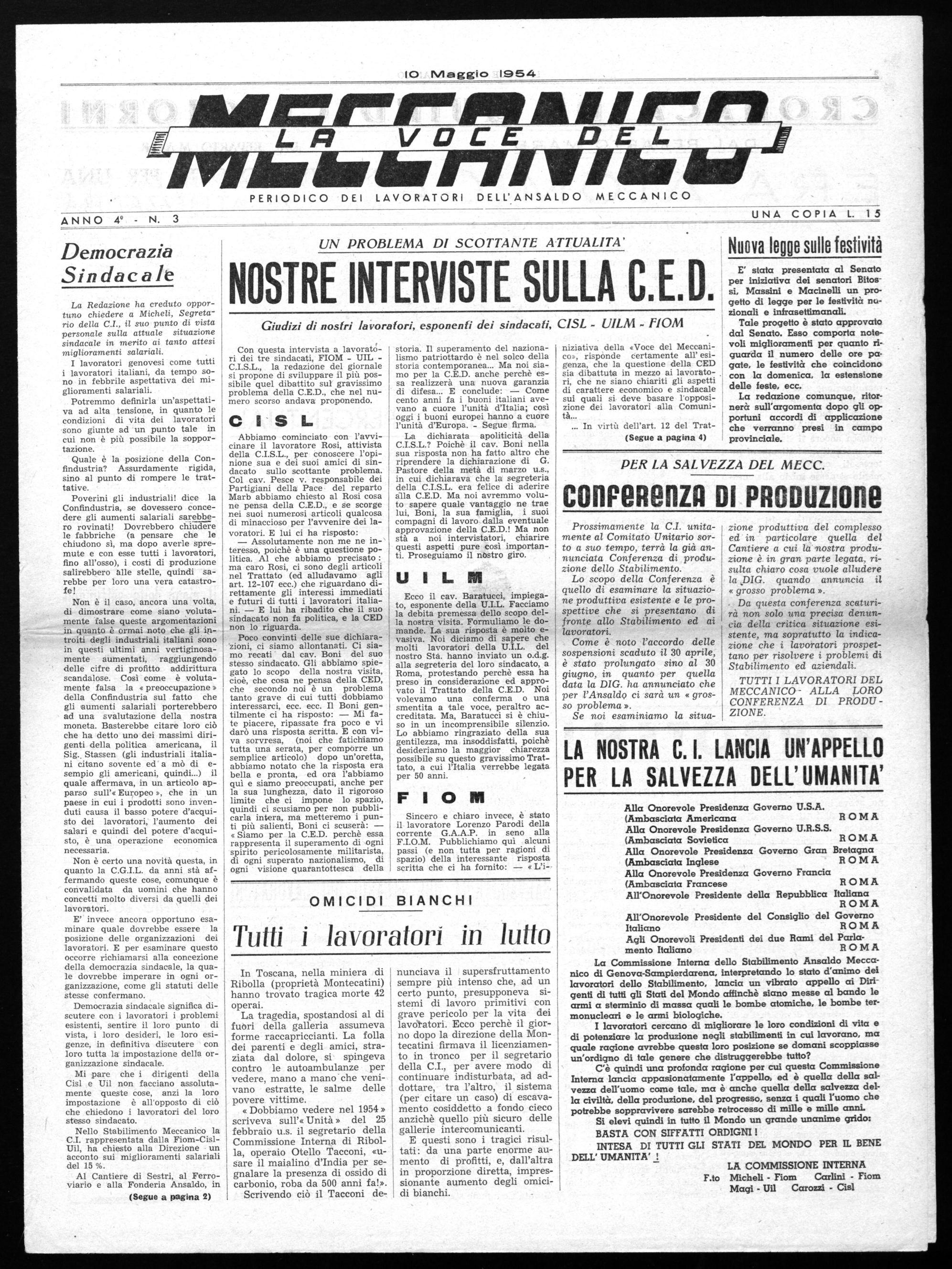 Con questa intervista a lavoratóri dei tre sindacati, FIOM - UILC.I.S.L., la redazione del giornale si propone di sviluppare il più possibile quel dibattito sul gravissimo problema della C.E.D., che nel numero scorso andava proponendo.