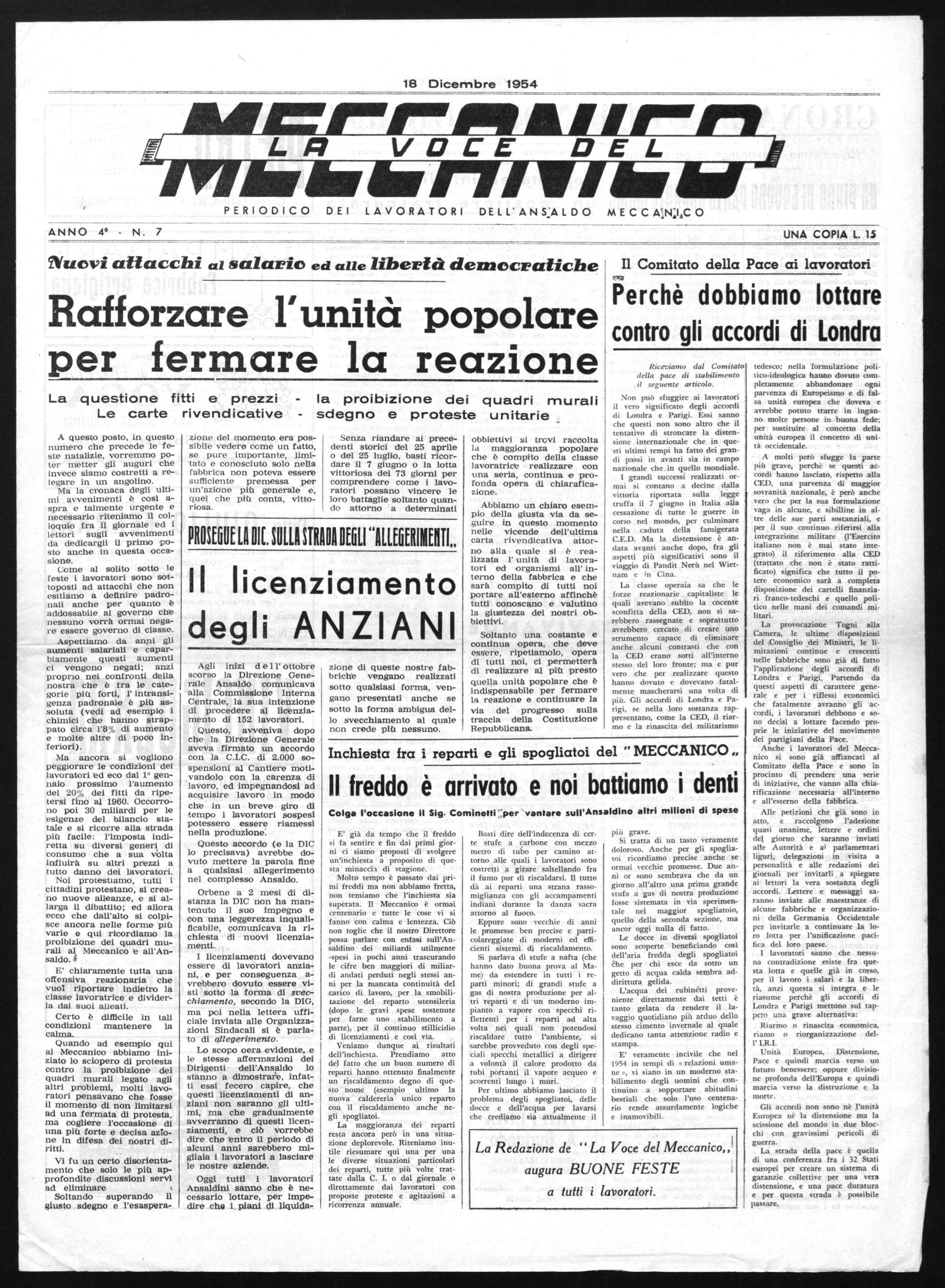 Lo scopo oera evidente, e le stesse affermazioni dei Dirigenti dell'Ansaldo lo stanno a dimostraée, infatti essi fecero capire, che questi licenziamenti di anziani non saranno gli ultimi, ma che gradualmente avverranno di questi licenziamenti, e ciò vorrebbe dire che entro il periodo di alcuni anni sarebbero migliaia i lavoratori a lasciare le nostre aziende.