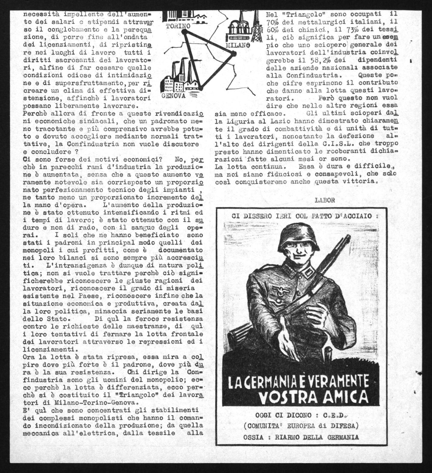 Ora la lotta é stata ripresa, essa mira a col pire dove più forte è il padrone, dove più du ra é la sua resistenza. Chi dirige la Confindustria sono gli uomini del monopolio; ecco perché la lotta è differenziata, ecco per= chè si è costituito il "Triangolo" dei lavora tori di Milano-Torino-Genova.