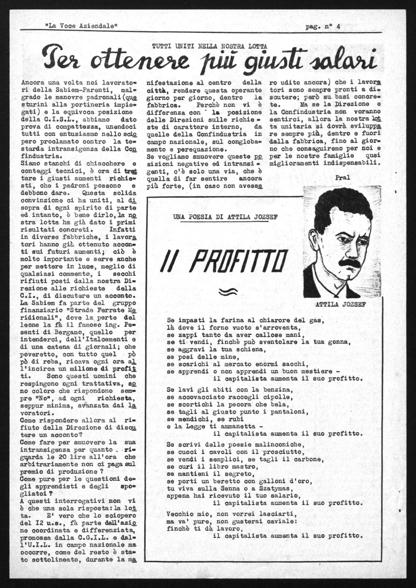 Se lavi gli abiti con la benzina, se accovacciato raccogli cipolle, se scortichi la pecora che bela, se tagli al giusto punto i pantaloni, se mendichi, se rubi e la Legge ti ammanettail capitalista aumenta il suo profitto. Se scrivi delle poesie malinconiche, se cuoci i cavoli con il prosciutto, se vendi i semplici, se tagli il carbone, se curi il libro mastro, se mantieni il segreto, se porti un beretto con galloni d'oro, tu viva sulla Senna o a Szatymas, appena hai ricevuto il tuo salario, il capitalista aumenta il suo profitto. Vecchio mio, non vorrei lasciarti, ma va' pure, non gusterai caviale: finché ti dà lavoro, il capitalista aumenta il suo profitto.