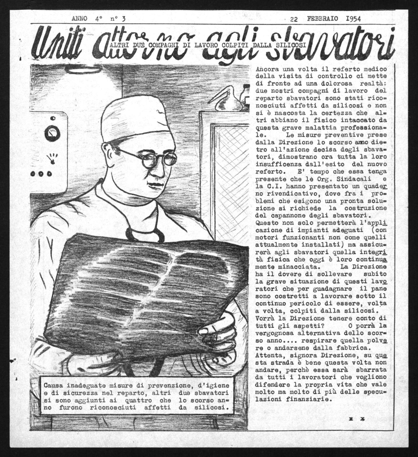 ALTRI DUE COMPAGNI DI LAVORO COLPITI DALLA SILI SI4,20Ancora una volta il referto medico della visita di controllo ci mette di fronte ad una dolorosa realtà: due nostri compagni di lavoro del reparto sbavatori sono stati rico= nosciuti affetti da silicosi e non si è nascosta la certezza che al= tri abbiano il fisico intaccato da questa grave malattia professionale. Le misure preventive prese dalla Direzione lo scorso anno dietro all'azione decisa degli sbava• tori, dimostrano ora tutta la loro insufficenza dall'esito del nuovo referto. E' tempo che essa tenga presente che le Org. Sindacali e la C.I. hanno presentato un quader no rivendicativo, dove fra i pro= blemi che esigono una pronta soluzione si richiede la costruzione del capannone degli sbavatori.