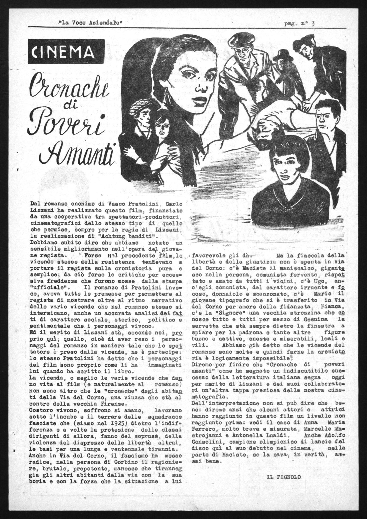 Dobbiamo subito dire Che abbiamo notato un sensibile miglioramento nell'opera dekgiova. ne regista. Forse n31 precedente film le vicende stesse della resistenza tendevano a portare il regista sulla cronistoria pura e semplice; da ciò forse le critiche per eccessiva freddezza che furono mosse dalla stampa "ufficiale". Il romanzo di Pratolini invece, aveva tutte le premesse per permettere al regista di mostrare oltre al ritmo narrativo delle varie vicende che nel romanzo stesso si intersicano, anche un accurata analisi dei fat ti di carattere sociale, storico, politico e sentimentale che i personaggi vivono..
