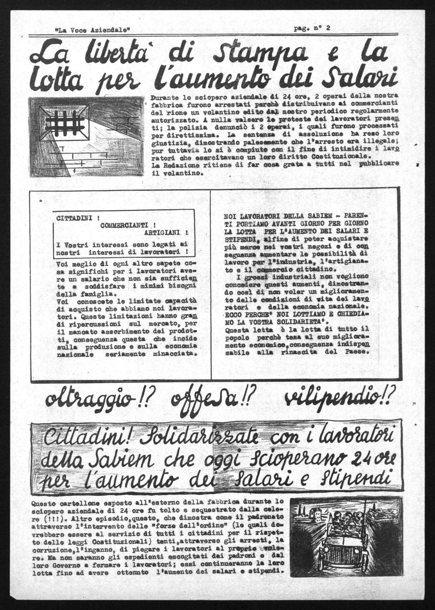 Questo cartellone esposto all'esterno della fabbrica durante lo sciopero aziendale di 24 ore fu tolto e sequestrato dalla celere (!!!). Altro episodio,questo, che dimostra come il padronato attraverso l'intervento delle "forze dell'ordine" (le quali dovrebbero essere al servizio di tutti i cittadini per il rispetto delle leggi Costituzionali) tenti,attraverso gli arresti, la corruzione,l'inganno, di piegare i lavoratori al propri.* vole. re. Ma non saranno gli espedienti escogitati dai padroni e dal loro Governo a fermare i lavoratori; essi continueranno la loro lotta fino ad avere ottenuto l'aumento dei salari e stipendi.