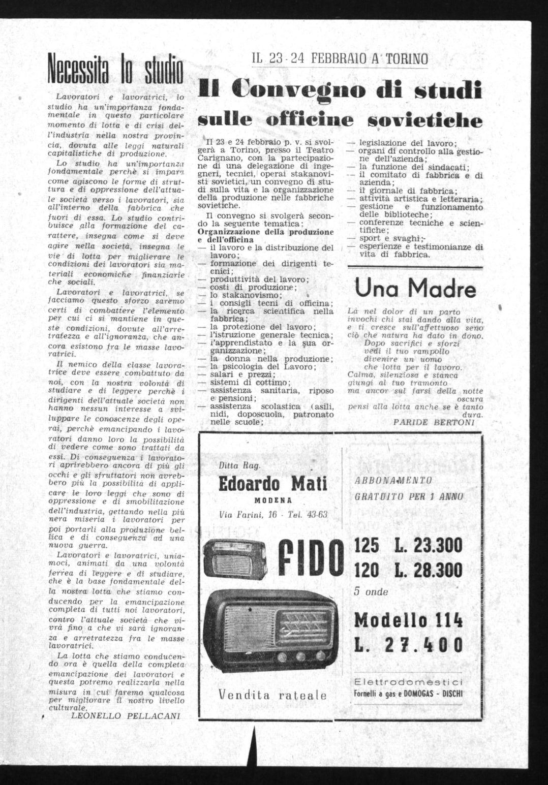 In 23 e 24 febbraio p. v. si svolgerà a Torino, presso il Teatro Carignano, con la partecipazione di una delegazione di ingegneri, tecnici, operai stakanovisti sovietici,. un convegno di studi sulla vita e la organizzazione della produzione nelle fabbriche sovietiche.