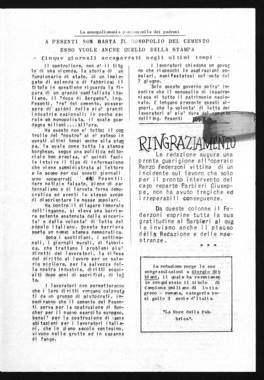 Sona i quoti di ani , i setti manal i , i giornali murali, di fabbrica, che trattano i problemi pi u' di retti dei I avora tori , la di fesa del di ri tto al lavoro per un sal ario migliore, per la salvezza della nostra industri a, di ri tti acquisi ti dopo anni di sacrifici , di lot te.