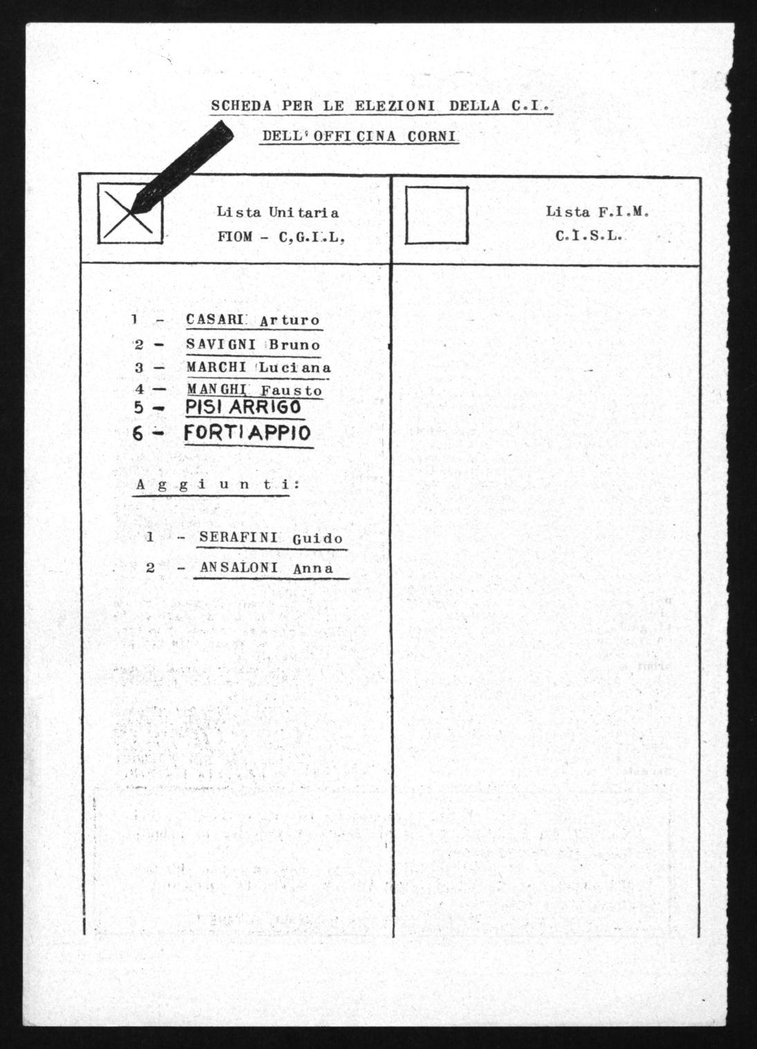 Non voteramo per i candidati di quel sindacato, le donne della Corni, che nel con so dello sciopero a tempo indeterminato che ha visto la piu' grande e completa unita> dei lavoratori organizzava il crumiraggio tradendo cosi' ti_kt ti i. dipendenti in lotta. Le donne voteranno per la lista FIOM,perche' sotto la guida di quel sindacato si sono effetti vamente ottrnuto aumerti tosi, come alla SIPE acconto uguale a quello degli uomini e che sorp assa due volte gli au- menti dei cosiddetti liberi sii ducati, Voteranno For.O.M. per che' i candidati di questa lista non sono stati scelti per "punizione" perche' sono arrivati tardi una mattina, o perche° lavorano mentre gli altri scioperano (vedi Cambi) ma pro senta una lista di uomini cepa ci, provati negli anni precedenti , che contribuirono con la loro rettitudine e il loro lavoro a rendere piu' grande e bella la nostra fabbrica che danno la garanzia di essere sempre alla testa dei loro elettori.