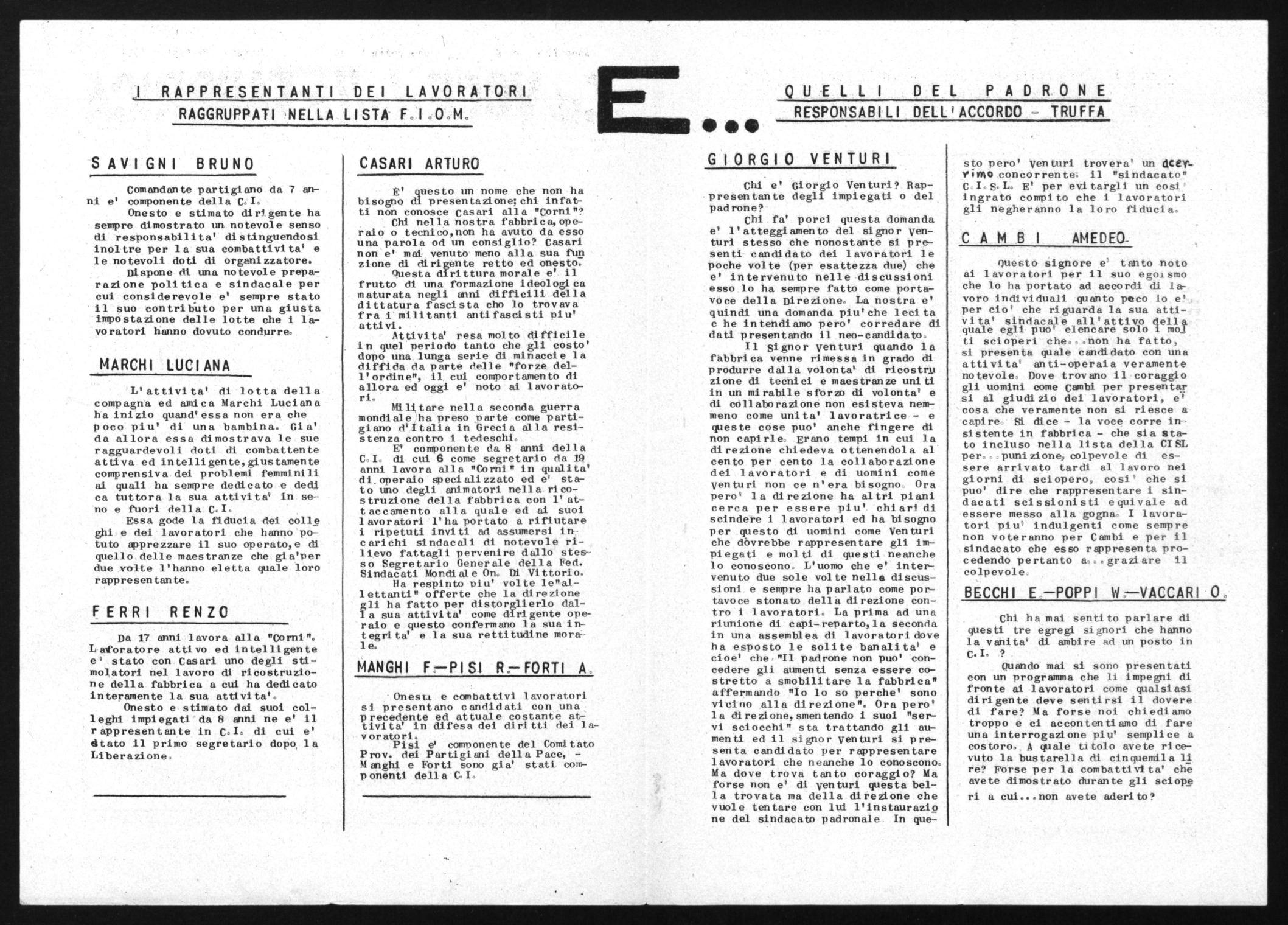 Onesto signore e tanto noto ai lavoratori per il suo egoismo che lo ha portato ad accordi di lavoro individuali quanto poco lo e' per dio' che riguarda la sua attivita' sindacale_all'attivo della. quale egli puo eencare solo i moi ti scioperi che non ha fatto, si presenta quale candidato con una attivita' arti-operaia veramente notevole- Dove trovano il coraggio gli uomini come Cambi per presentar si al giudizio dei lavoratori, e ° cosa che veramente non si riesce a capire Si dice la voce corre in sistente in fabbrica - che sia s tato incluso nella lista della CISL per. punizione, colpevole di essere arrivato tardi al lavoro nei giorni di sciopero, cosi' che si puo' dire che rappresentare i sindacati scissionisti equivale ad essere messo alla gogna I lavoratori piu' indulgenti come sempre non voteranno per Cambi e per il sindacato che esso rappresenta procedendo pertanto a .graziare il colpevole